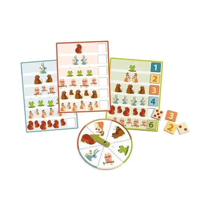 Bingo 1, 2, 3 est un jeu d'association et de collecte sur le thème des chiffres et des animaux de la forêt. Le coffret contient des planches, des jetons et une roue. Chaque joueur choisit une planche, puis tourne la roue pour collecter les jetons correspondants. Le premier à compléter sa planche gagne. Avec deux niveaux de difficulté (chiffres et constellations), ce jeu éducatif permet aux enfants d'apprendre à compter tout en s'amusant.