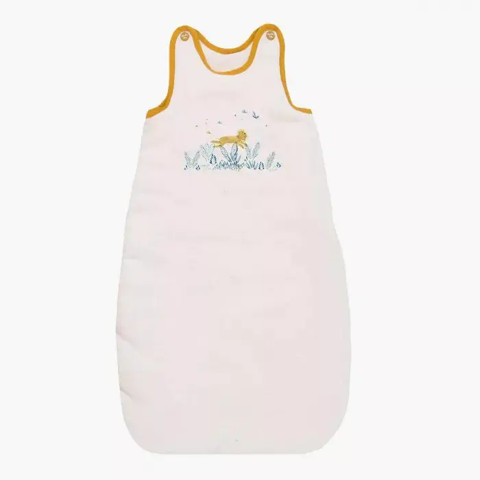 Gigoteuse 6-24 mois, en matières naturelles : lin lavé crème sur l’extérieur, et 100% coton à l’intérieur pour laisser respirer la peau de bébé. Imprimé de Paprika le lion dans la savane. Fermeture à glissière et boutons-pression pour un habillage facile.