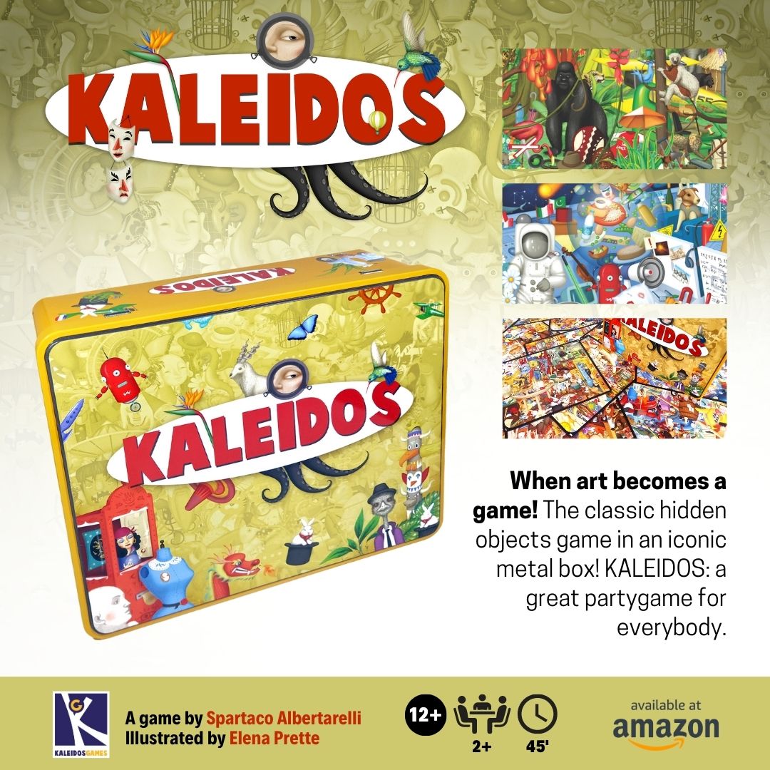 Dans Kaleidos, le but du jeu est d’identifier dans des images spécialement créées le plus grand nombre d’éléments dont le nom commence par une lettre sélectionnée au hasard. Chaque image contient un nombre incroyable d’éléments différents, mais avec de l’imagination, il est possible d’identifier même ceux qui ne sont pas immédiatement visibles. Rapide, dynamique et présenté dans une élégante boîte métallique, il est parfait même pour les grands groupes divisés en équipes.