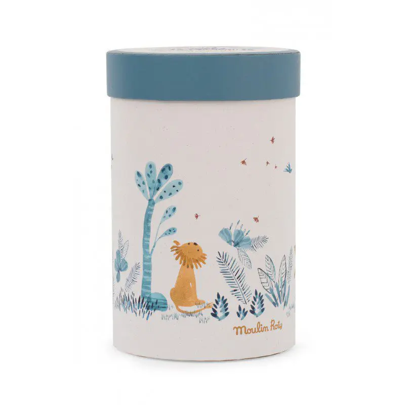 Paprika le lion nous offre un grand sourire et plein de curiosités au toucher : de longues pattes à attraper, une crinière et des moustaches à tortiller, et un corps moelleux pour se reposer… Il est installé dans une jolie boîte cadeau toute en rondeur.