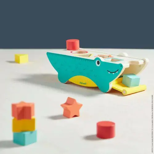 Crocodile affamé cherche formes pour se régaler ! Voici une boîte à formes en bois originale qui amusera les enfants dès 12 mois pendant de longs moments ! En forme de crocodile, ce jouet premier âge est livré avec 8 pièces à encastrer : 2 ronds, 2 triangles, 2 étoiles et 2 carrés. Chaque forme correspond à une couleur, pour un apprentissage et une manipulation facile par bébé. Quand notre ami crocodile a bien mangé, on ouvre grand sa bouche pour récupérer les pièces (ouverture magnétique).