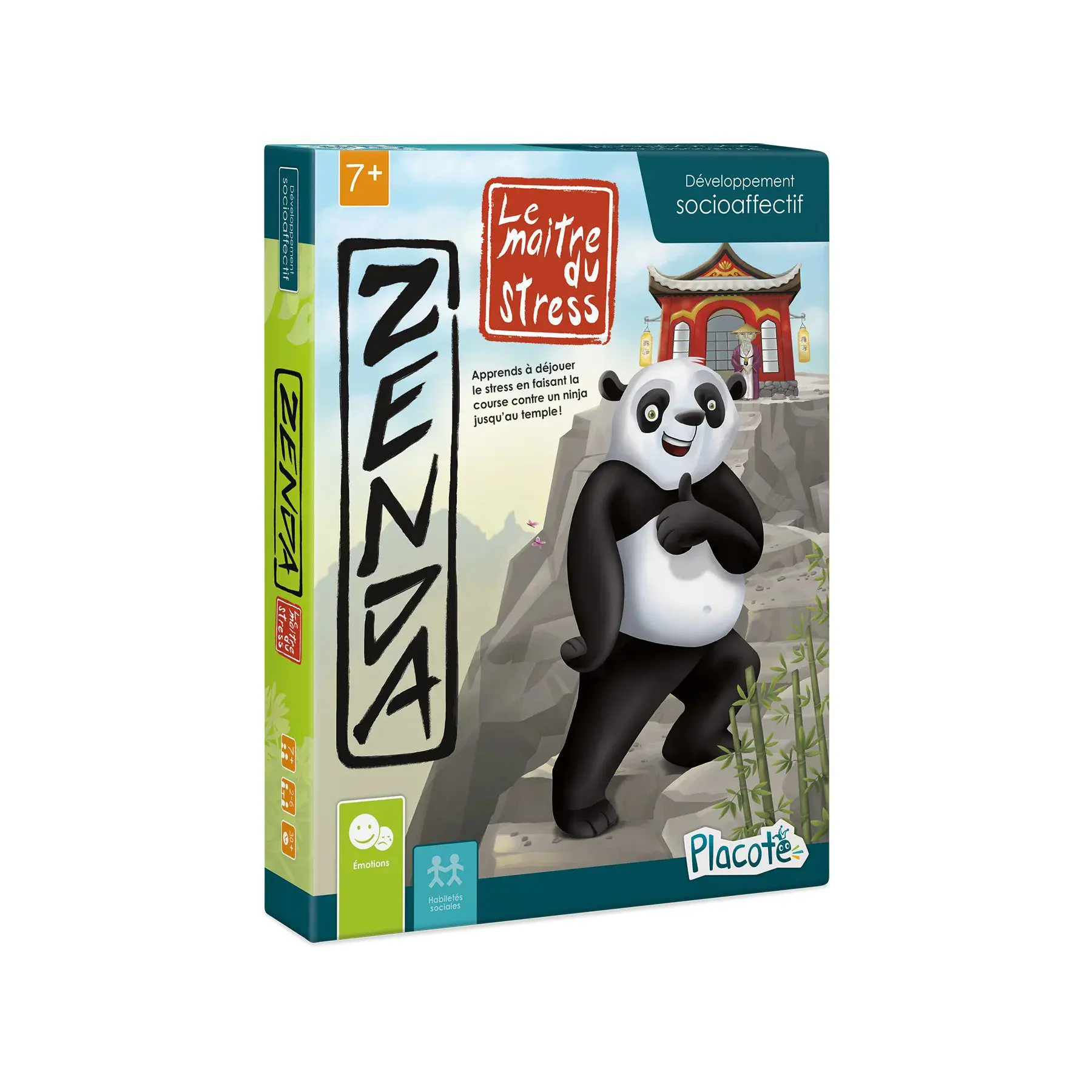 Zenda : le maître du stress (dès 7 ans) est un jeu de plateau éducatif où les enfants doivent faire avancer le panda Zenda jusqu’au temple en répondant à des questions et en réalisant des « défis zen » pour arriver au bout du parcours avant le ninja, qui représente le stress. En jouant, les enfants apprennent à reconnaître les signes de stress et à mettre en pratique différentes techniques pour le gérer. Le jeu introduit également le concept « SPIN » qui aide à comprendre les ingrédients de la recette du stress et comment notre cerveau détecte les situations stressantes.