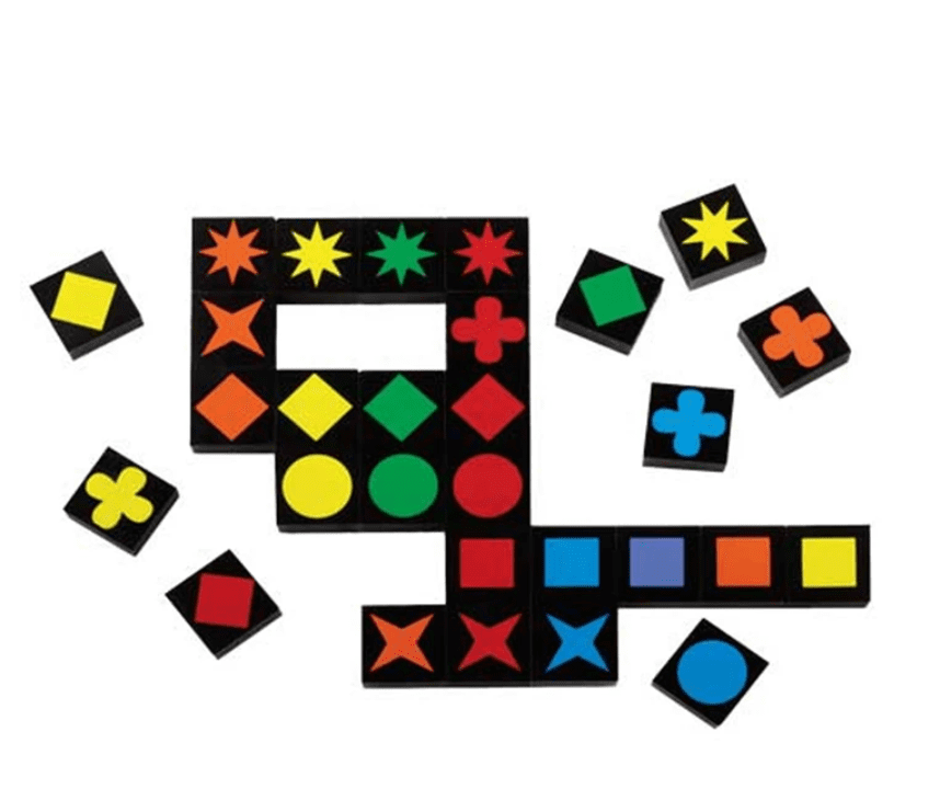 Qwirkle (dès 8 ans) : Dans ce jeu, les enfants doivent placer 108 gros blocs de bois, les formes doivent différer si elles sont de la même couleur ou les couleurs si elles sont de la même forme. Le but est d’obtenir le plus de points possibles.