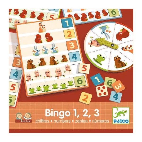 Bingo 1, 2, 3 est un jeu d'association et de collecte sur le thème des chiffres et des animaux de la forêt. Le coffret contient des planches, des jetons et une roue. Chaque joueur choisit une planche, puis tourne la roue pour collecter les jetons correspondants. Le premier à compléter sa planche gagne. Avec deux niveaux de difficulté (chiffres et constellations), ce jeu éducatif permet aux enfants d'apprendre à compter tout en s'amusant.