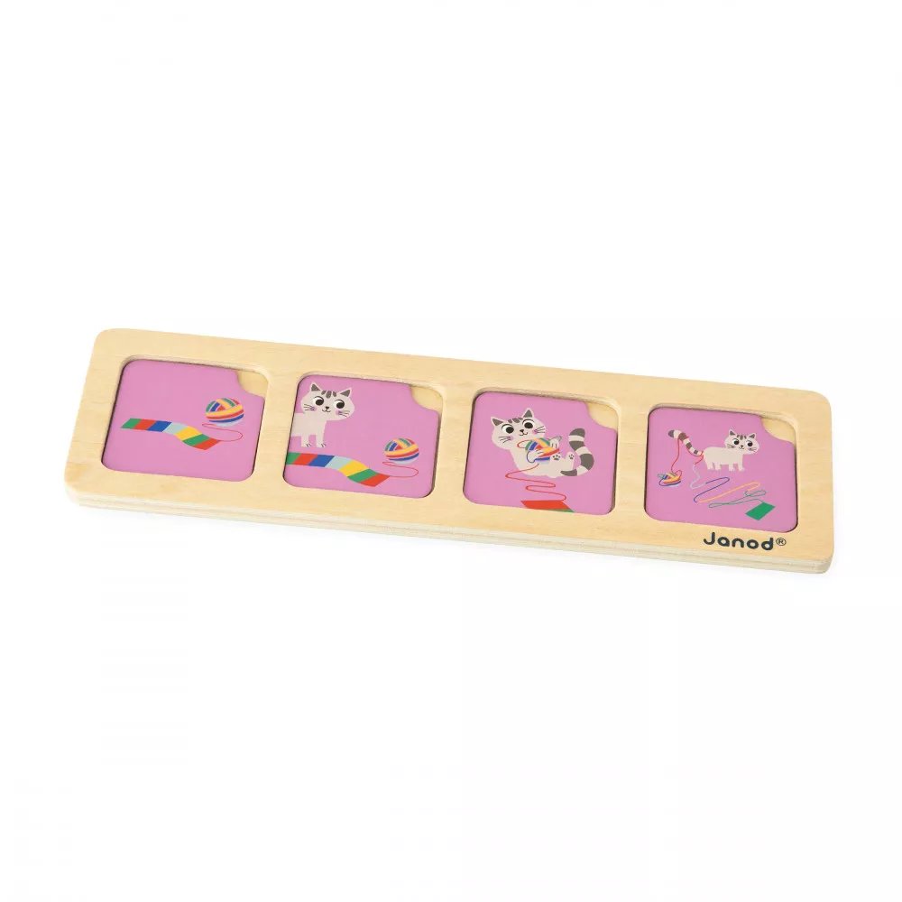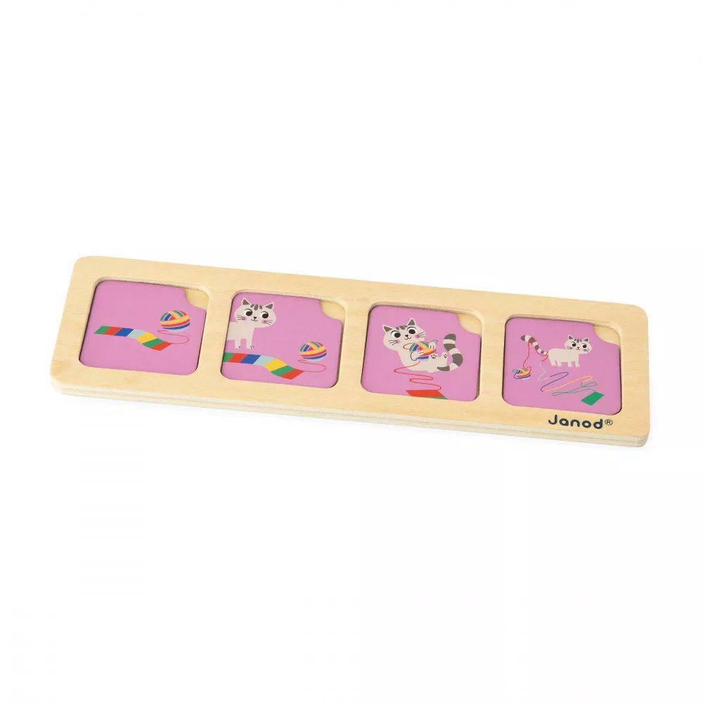 Acquérir la notion de chronologie est une étape importante des apprentissages de la maternelle. Dès la petite section, les enfants commencent à se familiariser avec les séquences qu'ils devront apprendre à remettre dans le bon ordre. Facilitez cette initiation avec ce joli jeu éducatif en bois pour les enfants dès 3 ans. Afin de travailler sa logique tout en s'amusant, l'enfant devra observer les 4 cartes d'une scène et les replacer dans le bon ordre. 10 scènes différentes sont à reconstituer ! Ce jeu permet à la fois de développer la réflexion et l'attention, mais également d'enrichir le vocabulaire des enfants et leur connaissance de la nature. Comment une graine se transforme-t-elle en fleur ? Comment se forme le papillon ? Le support en bois est très malin ! Des points de couleurs permettent de vérifier le bon emplacement de la carte et l'enfant est donc capable de s'amuser en toute autonomie. Dans le cadre d'un atelier en duo, vous pourrez accompagner votre enfant dans son apprentissage en le laissant placer les cartes sur le support, puis vous expliquer le déroulement de la scène. Une notice explicative vous permettra d'utiliser au mieux ce jeu destiné aux enfants de petite, moyenne et grande section de maternelle. Ce jeu fait partie de la gamme pédagogique Janod, développée en collaboration avec une professeure des écoles afin de coller au mieux aux apprentissages et aux programmes de chaque niveau. Il est fabriqué en bois et carton FSC®.