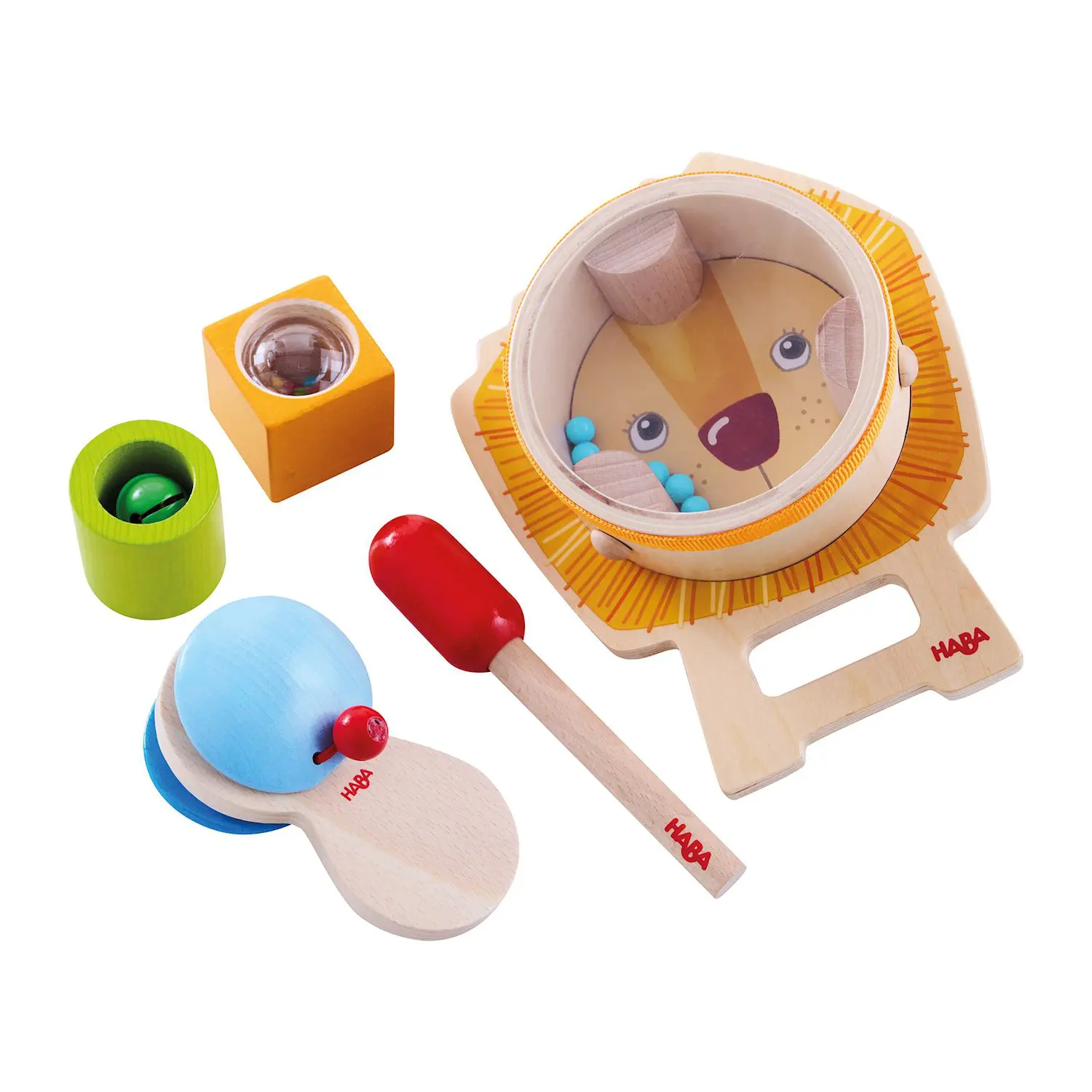 Les enfants adorent faire de la musique tout seuls ! Avec l’ensemble de jeux Léo le lion, ils pourront reproduire les sons et les rythmes les plus divers grâce au tambour-lion (avec tambour, hochet à bruit de billes et crinière à faire cliqueter), aux castagnettes et aux cubes sonores. Même les plus petits pourront aborder le monde des sons de manière ludique.