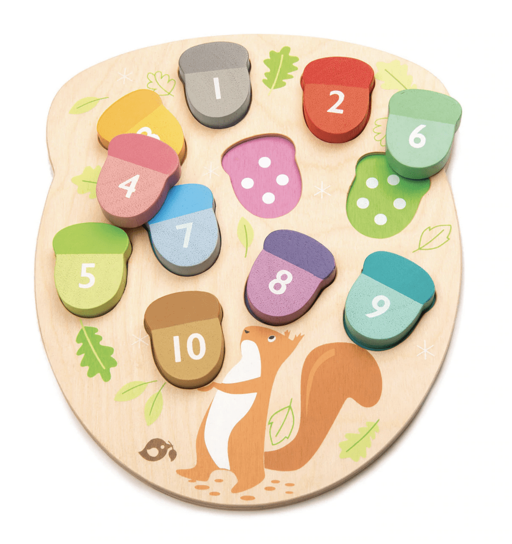 Peux-tu aider le petit écureuil à compter tous les glands ? Apprends les chiffres et les couleurs avec ce jeu de glands aux couleurs vives. Ce set comprend 10 glands en bois colorés, chacun révélant la couleur et le nombre de points correspondants.