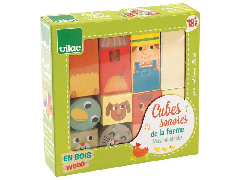 Dans ces cubes sonores, ni pile ni électronique ! Les bruits tout doux sont obtenus grâce à des billes, du sable et des perles enfermées à l’intérieur des cubes. La vache ne fera donc pas « meuuuuh », mais « tchik tchik ». Les petits découvriront avec curiosité le bruit de chaque animal.