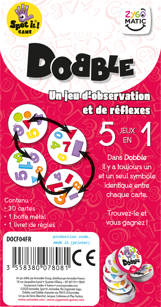 Quel que soit le jeu choisi, repérez plus vite que vos adversaires le seul et unique symbole identique entre deux cartes puis nommez-le à haute voix. Ensuite, récupérez la carte comportant le même symbole que la vôtre, défaussez votre carte ou refilez-la à un adversaire, selon les règles de la variante à laquelle vous jouez.