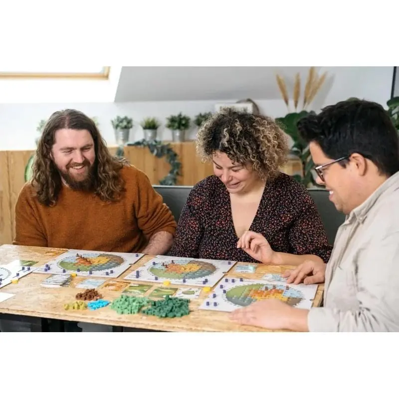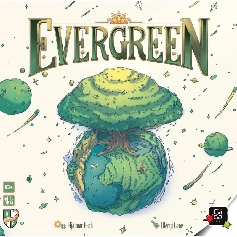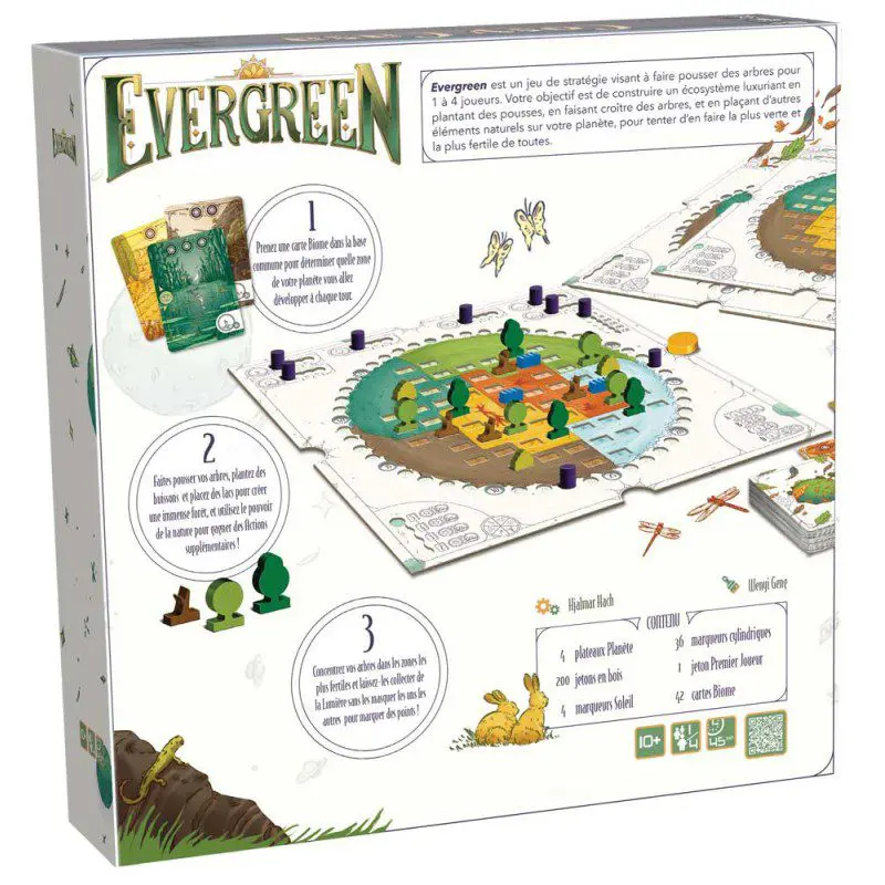Evergreen est un jeu de stratégie pour 1 à 4 joueurs par Hjalmar Hach, concepteur du jeu primé Photosynthésis, où votre objectif est de construire un écosystème luxuriant, en plantant des graines, en faisant pousser des arbres et en plaçant d’autres éléments naturels sur votre planète, en essayant d’en faire la plus verte et la plus fertile de toutes.