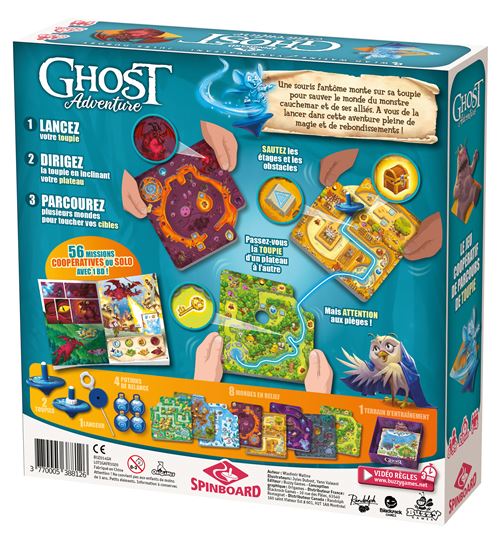 « Ghost Adventure » est un jeu coopératif qui se joue debout, autour d’une table sans chaise. Les joueurs se relaient pour réaliser ensemble des missions. Chaque mission représente un parcours différent qu’ils vont devoir effectuer avec une toupie à travers plusieurs plateaux. Ils représentent 8 mondes et de nombreuses cibles à atteindre.