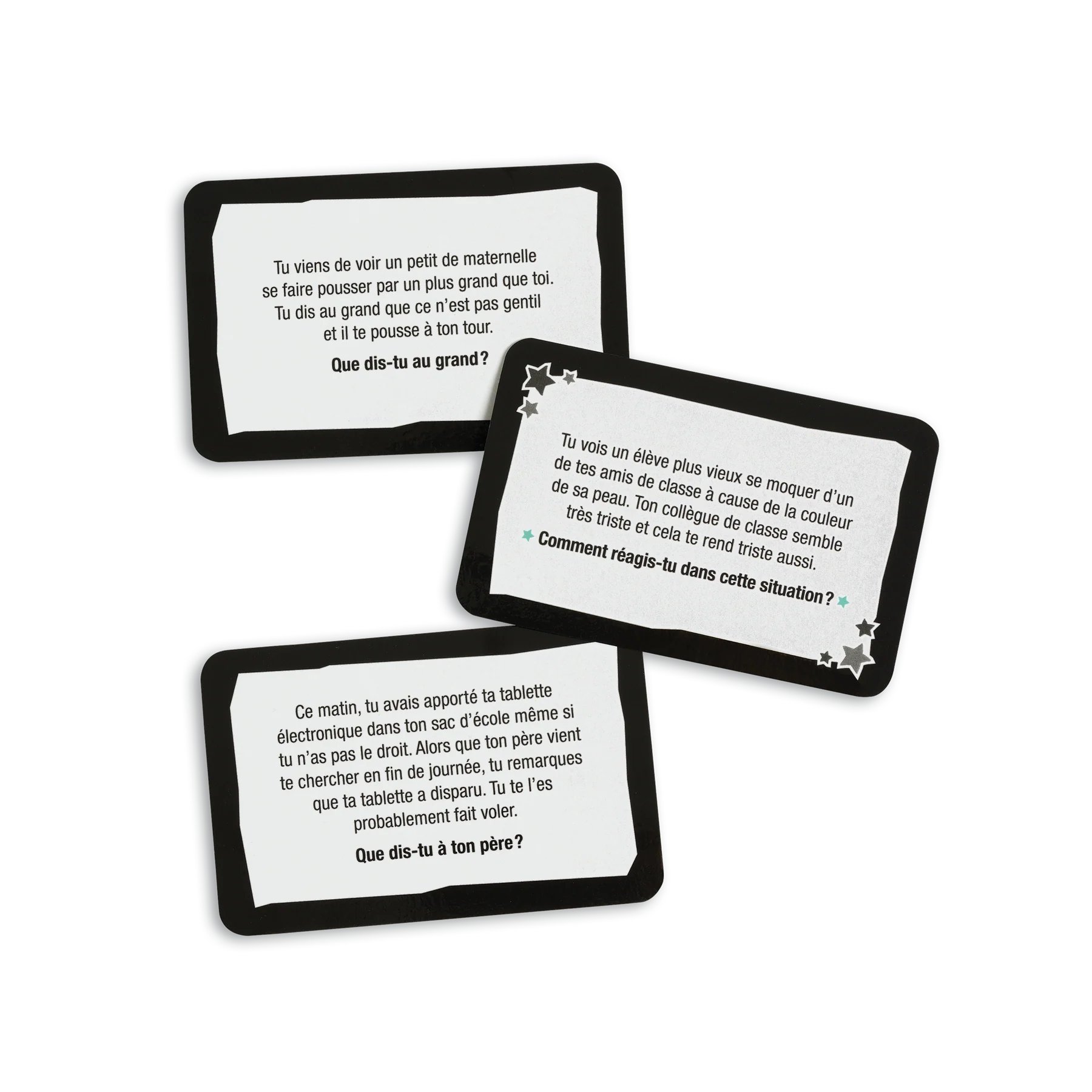 Tu viens de recevoir en cadeau un chandail que tu trouves laid. Ton voisin de classe tente de copier sur toi pendant un examen. Tu as brisé un livre qu’un ami t’a prêté. Que fais-tu dans ces situations ? N’oublie pas d’utiliser tes talents d’acteur !