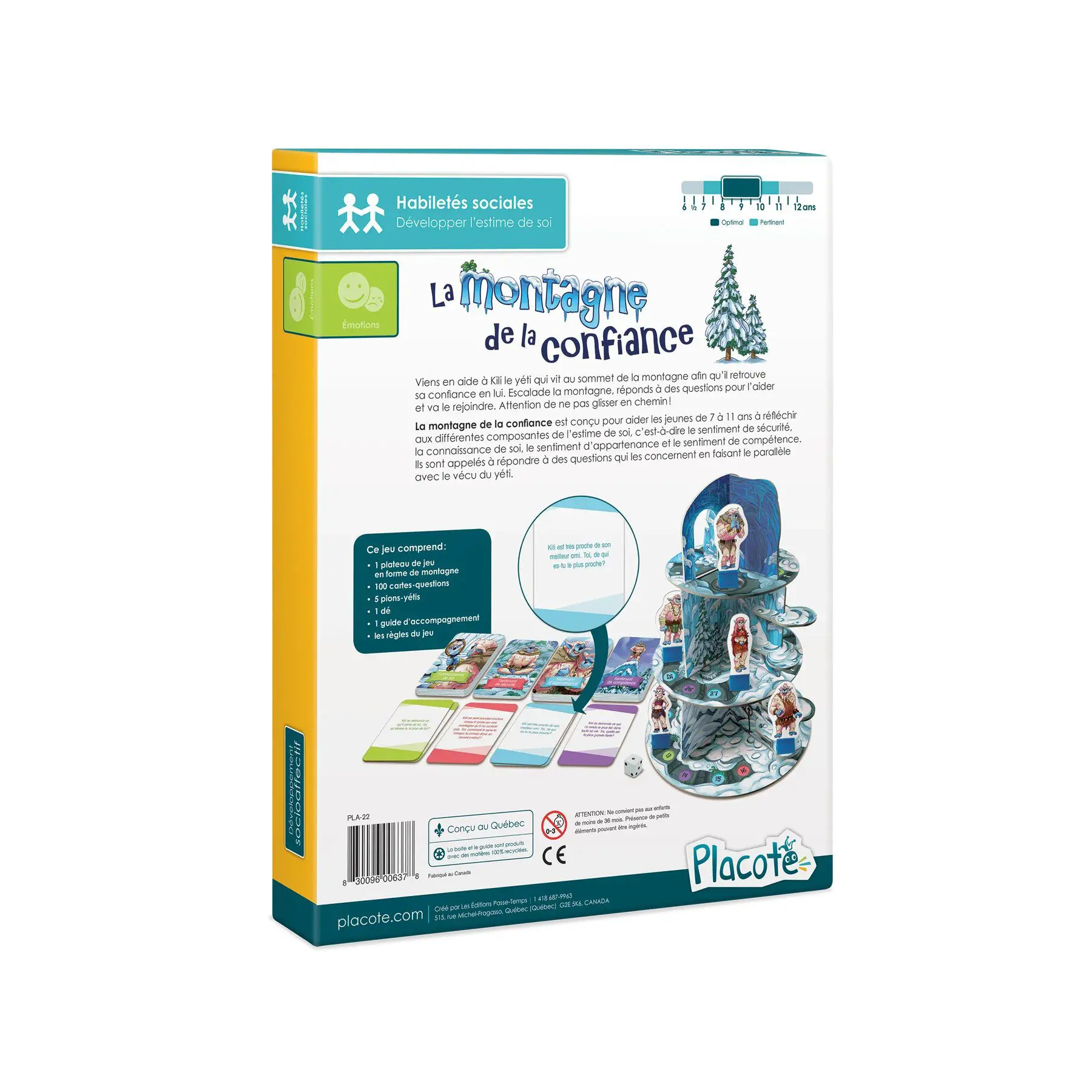 La montagne de la confiance est conçu pour aider les jeunes de 7 à 11 ans à réfléchir aux différentes composantes de l’estime de soi, c’est-à-dire le sentiment de sécurité, la connaissance de soi, le sentiment d’appartenance et le sentiment de compétence. Ils sont appelés à répondre à des questions qui les concernent en faisant le parallèle avec le vécu du yéti.