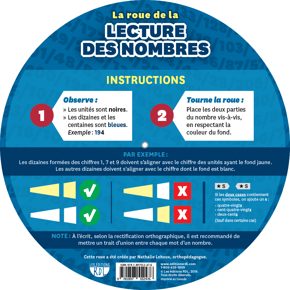 Faites tourner les roues pour former le nombre désiré en alignant les unités, les dizaines et les centaines. Ensuite, observez comment ce nombre s’écrit en lettres.