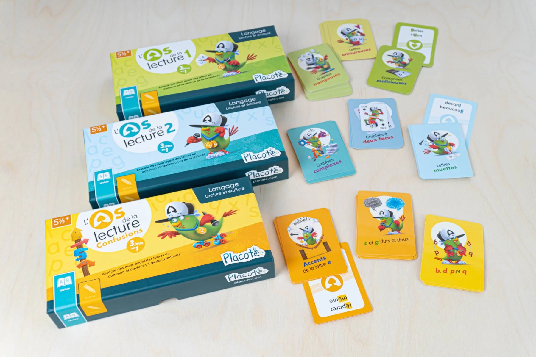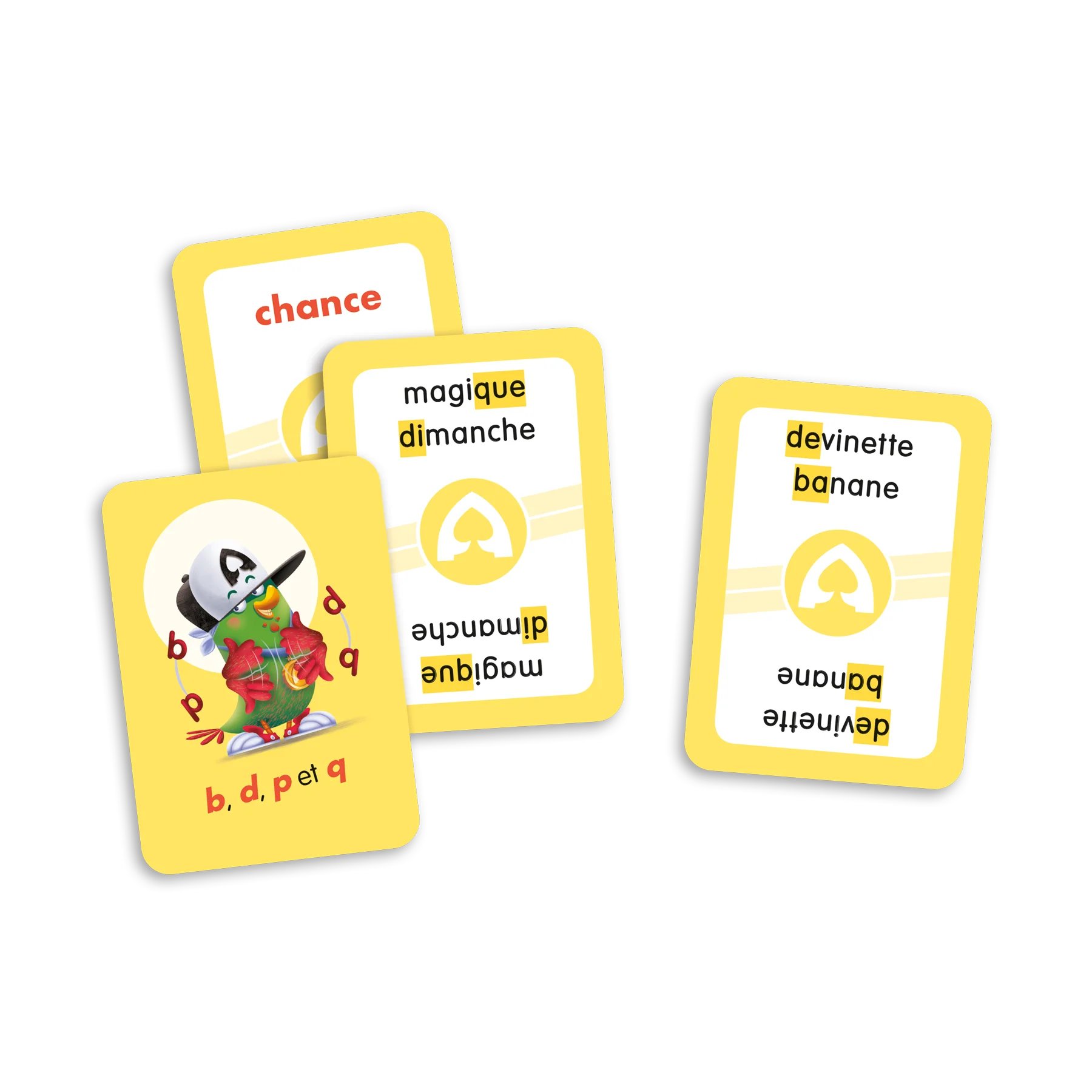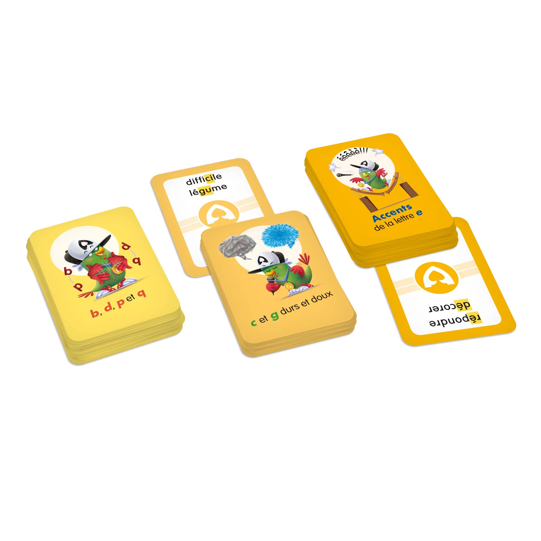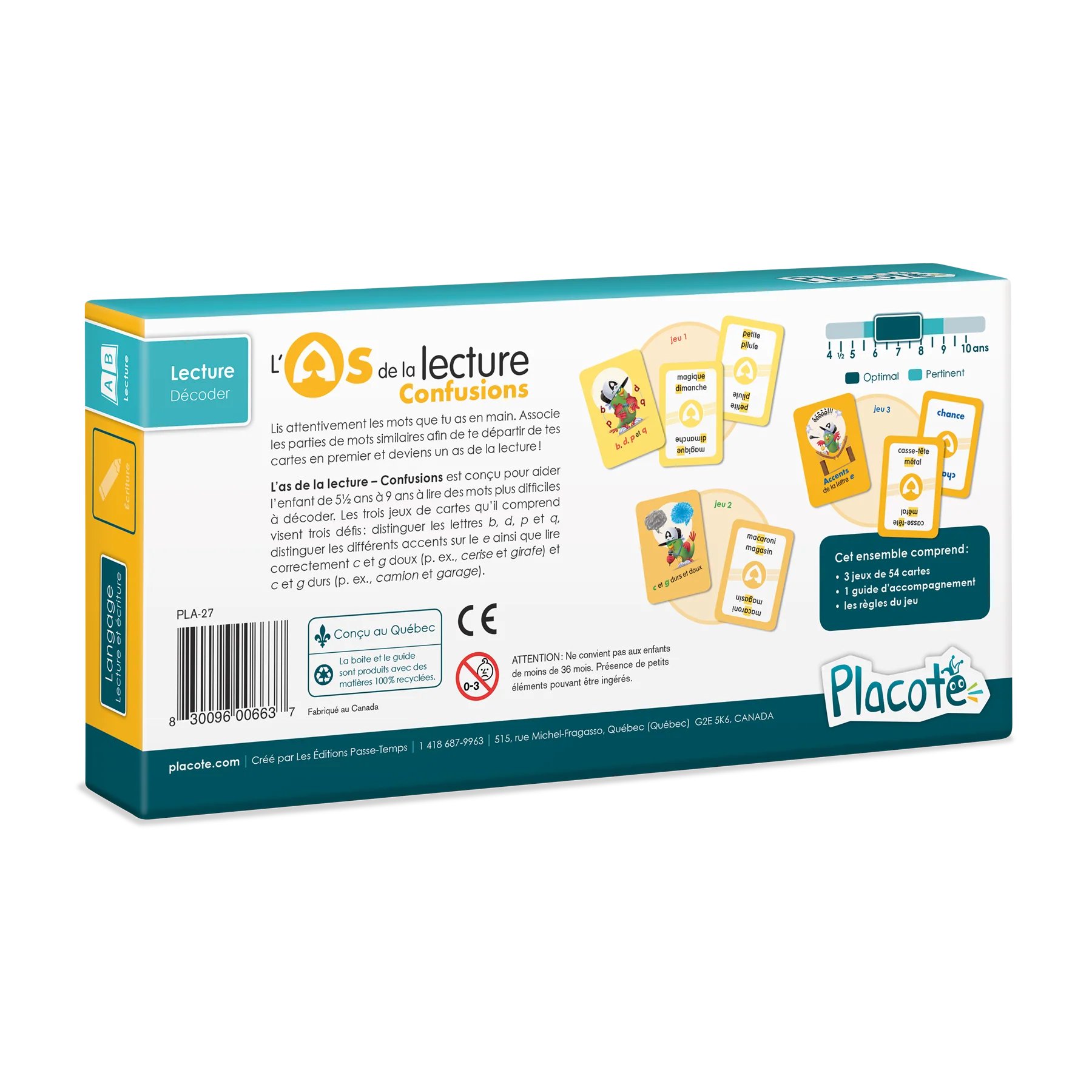 L’as de la lecture – Confusions est conçu pour aider l’enfant de 5½ ans à 9 ans à lire des mots plus difficiles à décoder. Les trois jeux de cartes qu’il comprend visent trois défis: distinguer les lettres b, d, p et q, distinguer les différents accents sur le e ainsi que lire correctement c et g doux (p. ex., cerise et girafe) et c et g durs (p. ex., camion et garage).