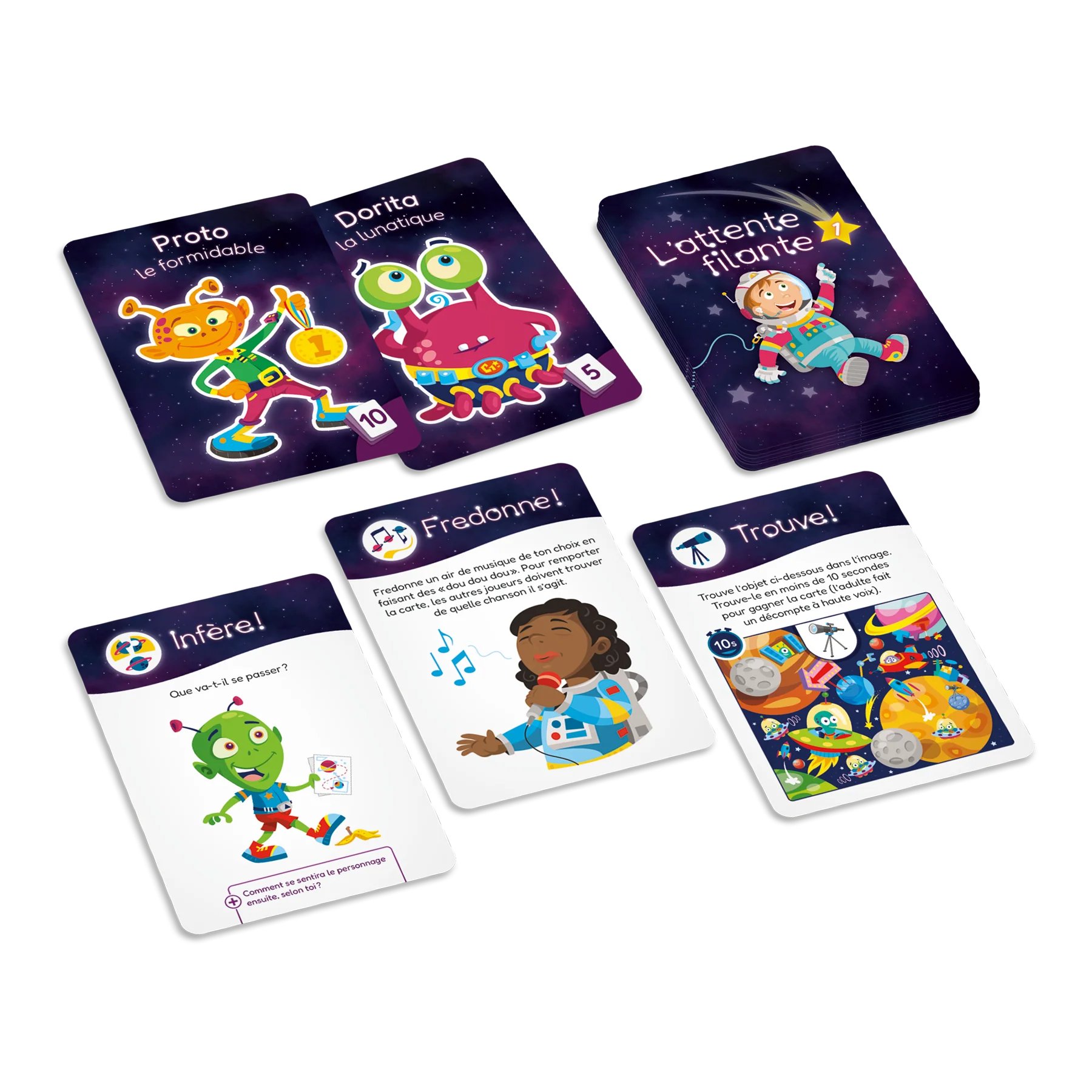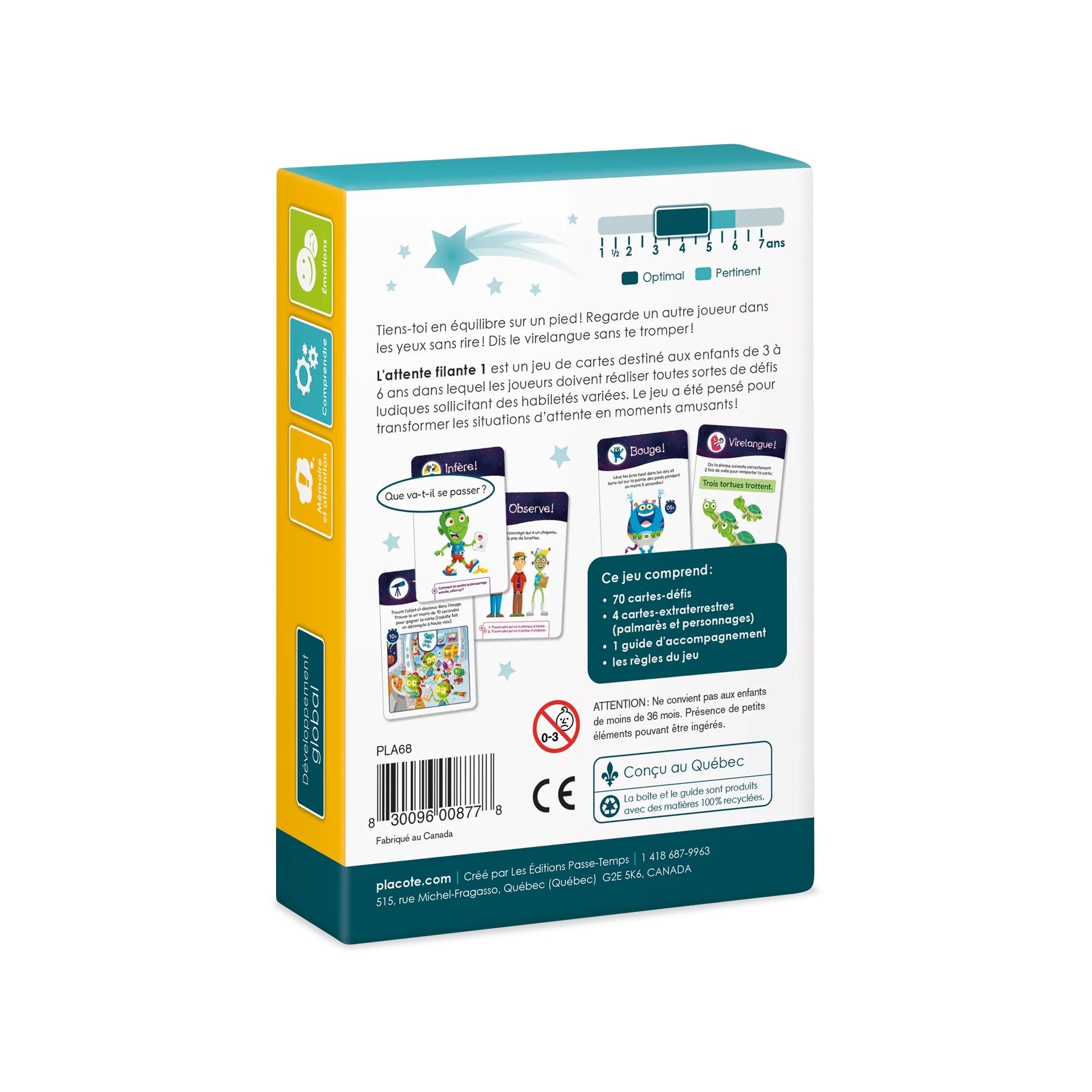 L’attente filante 1 est un jeu de cartes destiné aux enfants de 3 à 6 ans dans lequel les joueurs doivent réaliser toutes sortes de défis ludiques sollicitant des habiletés variées. Le jeu a été pensé pour transformer les situations d’attente en moments amusants !