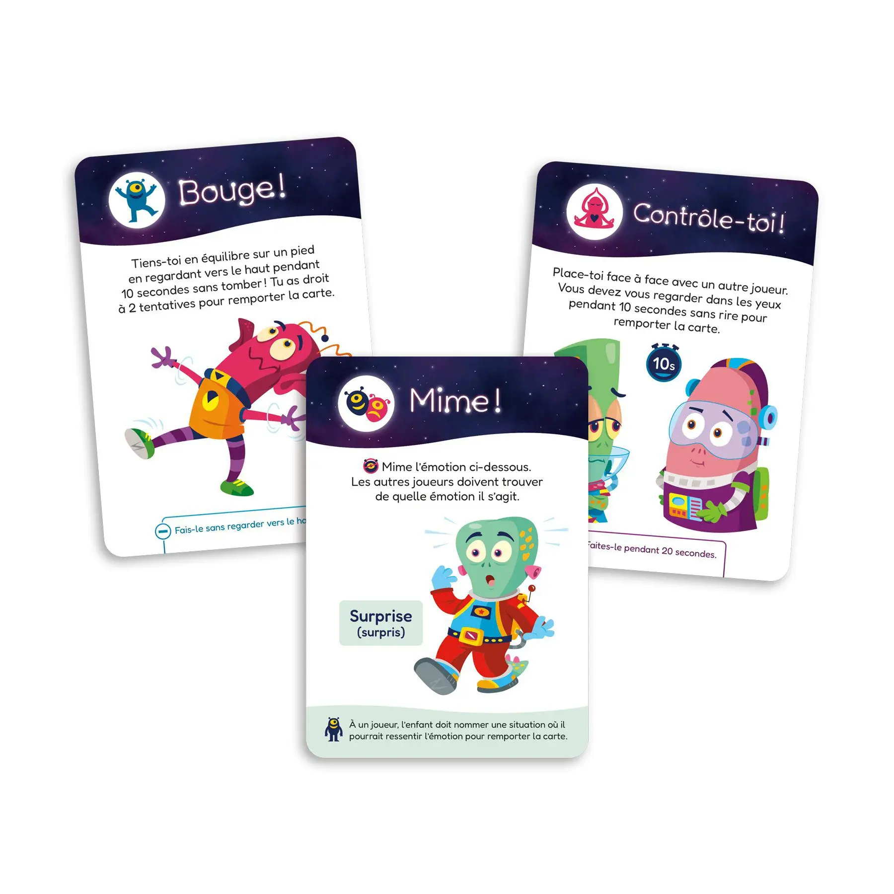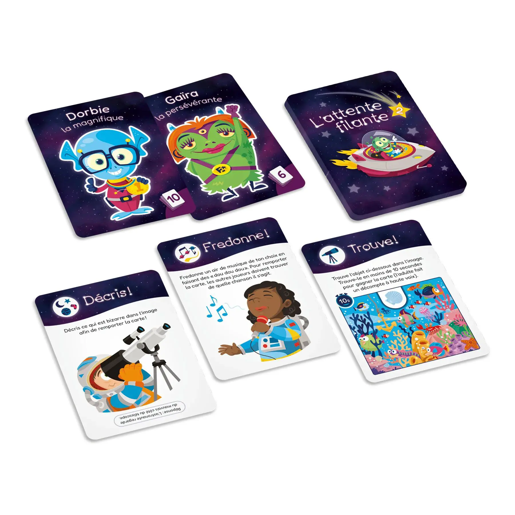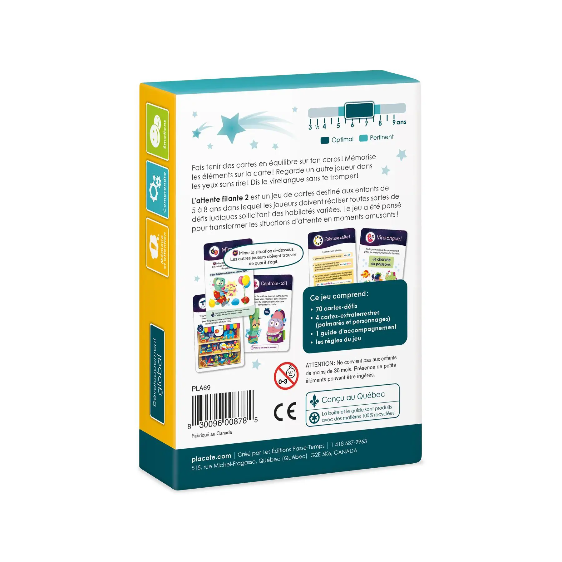 « L’attente filante 2 » est un jeu de cartes destiné aux enfants de 5 à 8 ans. Dans ce jeu, les joueurs doivent relever divers défis amusants qui sollicitent une gamme d’habiletés différentes. Les défis incluent des activités telles que faire tenir des cartes en équilibre sur son corps, mémoriser des éléments sur une carte, regarder un autre joueur dans les yeux sans rire, ou encore dire un virelangue sans se tromper.