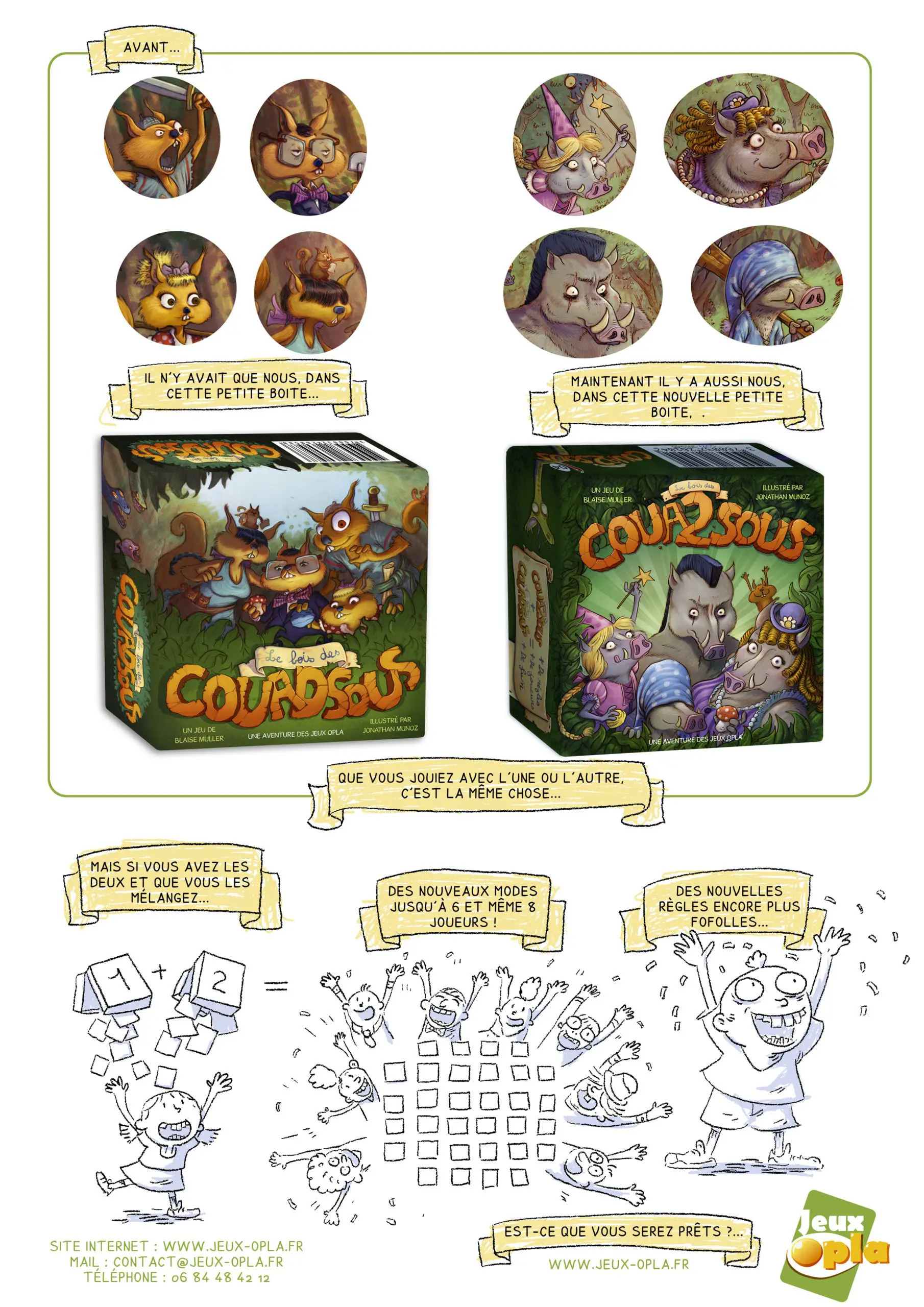 Le Bois des Coua2sous propose la même mécanique de jeu que son grand frère Le Bois des Couadsous, dans un nouveau décor et avec de nouveaux personnages : les Sangliers sont arrivés ! Ainsi, ceux qui n’ont pas le jeu peuvent choisir lequel ils préfèrent, et… Ceux qui ont les deux jeux auront de nouvelles et riches perspectives de jeu !