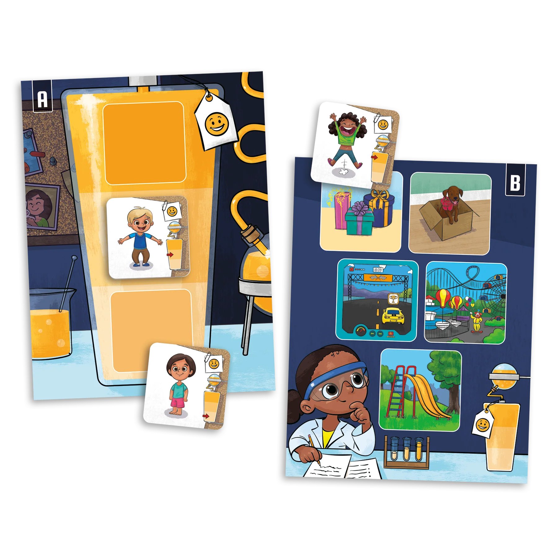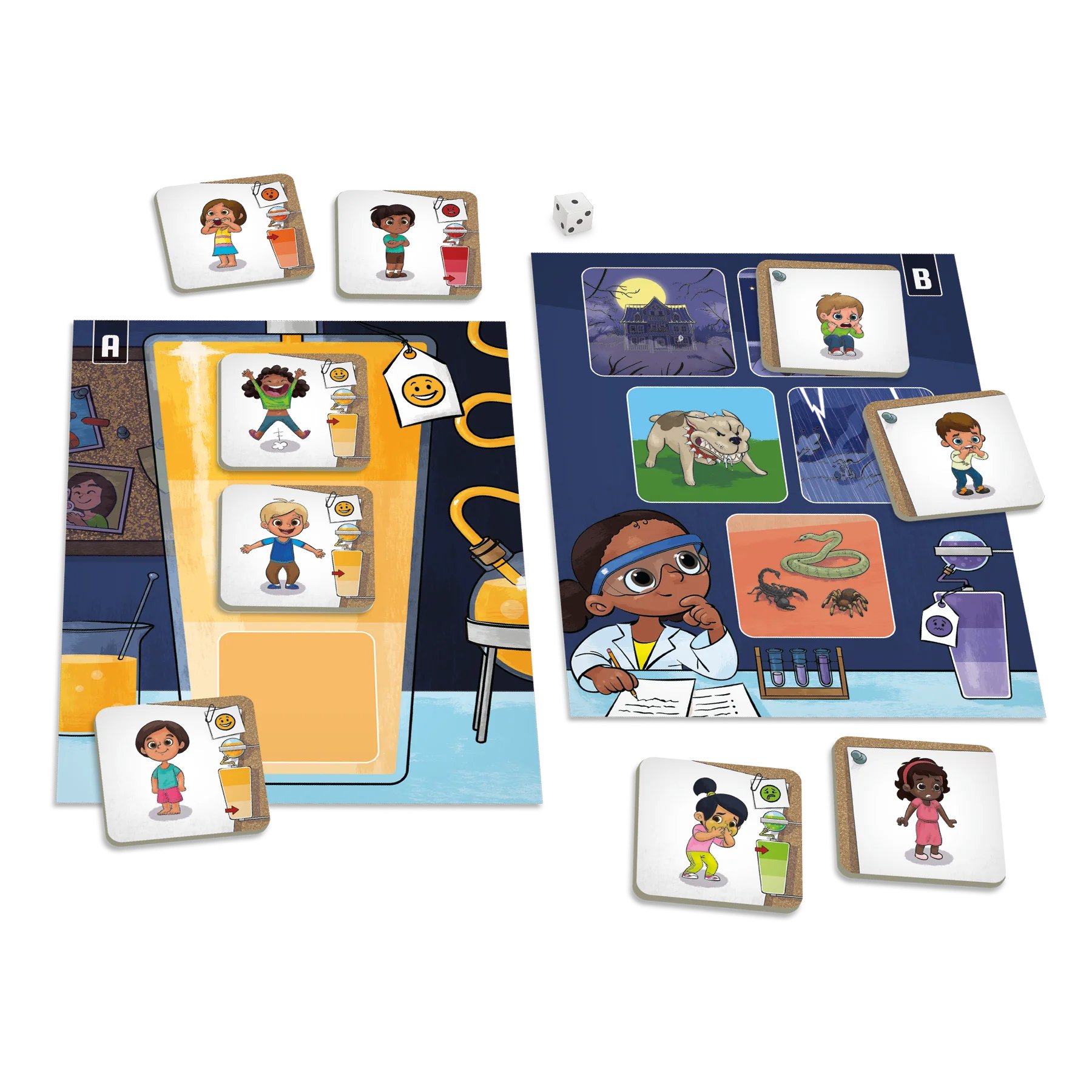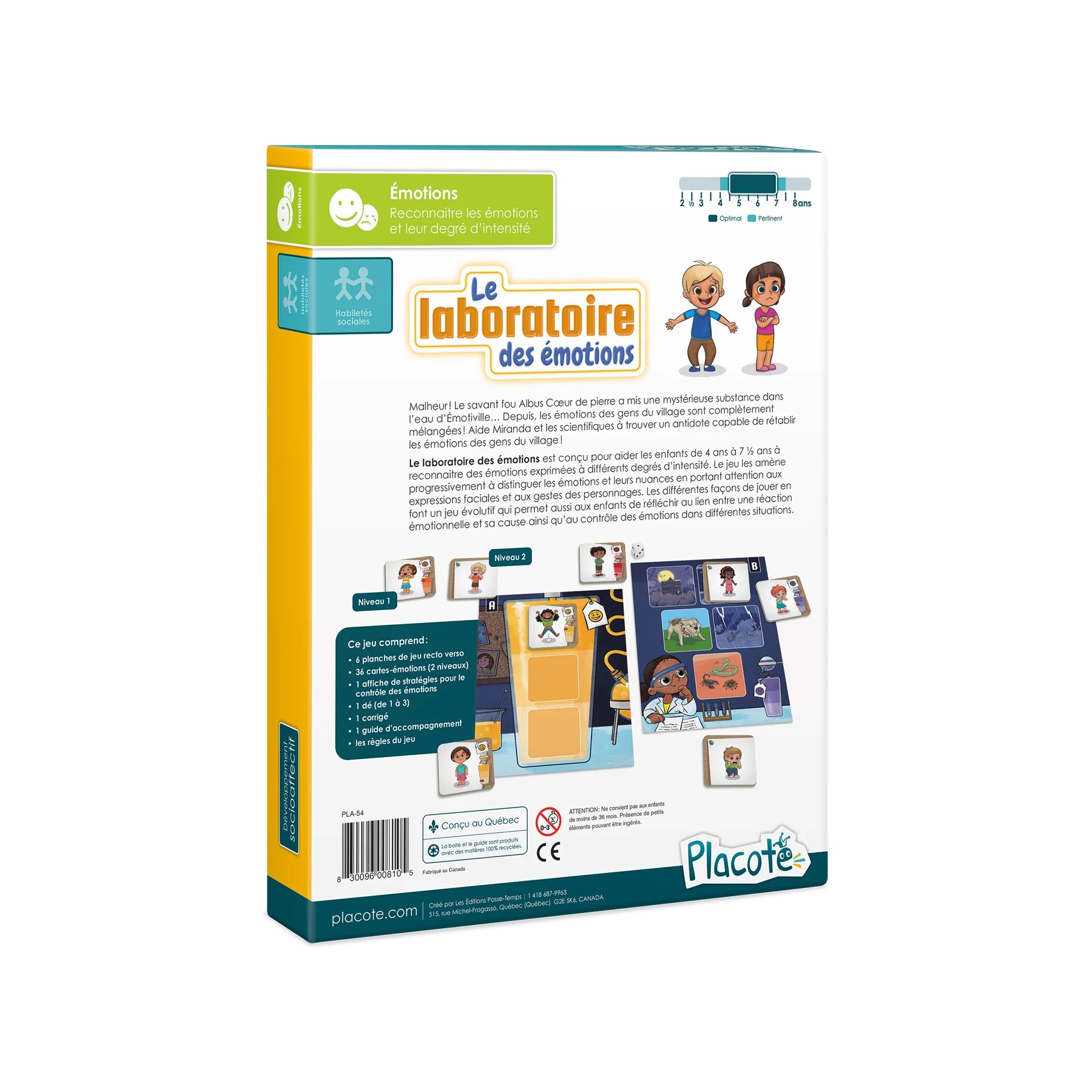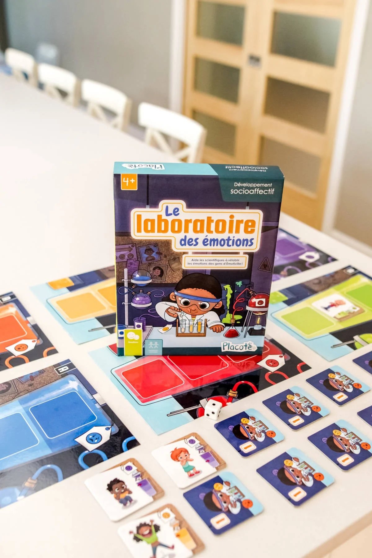 Le laboratoire des émotions est conçu pour aider les enfants de 4 ans à 7½ ans à reconnaitre des émotions exprimées à différents degrés d’intensité. Le jeu les amène progressivement à distinguer les émotions et leurs nuances en portant attention aux expressions faciales et aux gestes des personnages. Les différentes façons de jouer en font un jeu évolutif qui permet aussi aux enfants de réfléchir au lien entre une réaction émotionnelle et sa cause ainsi qu’au contrôle des émotions dans différentes situations.