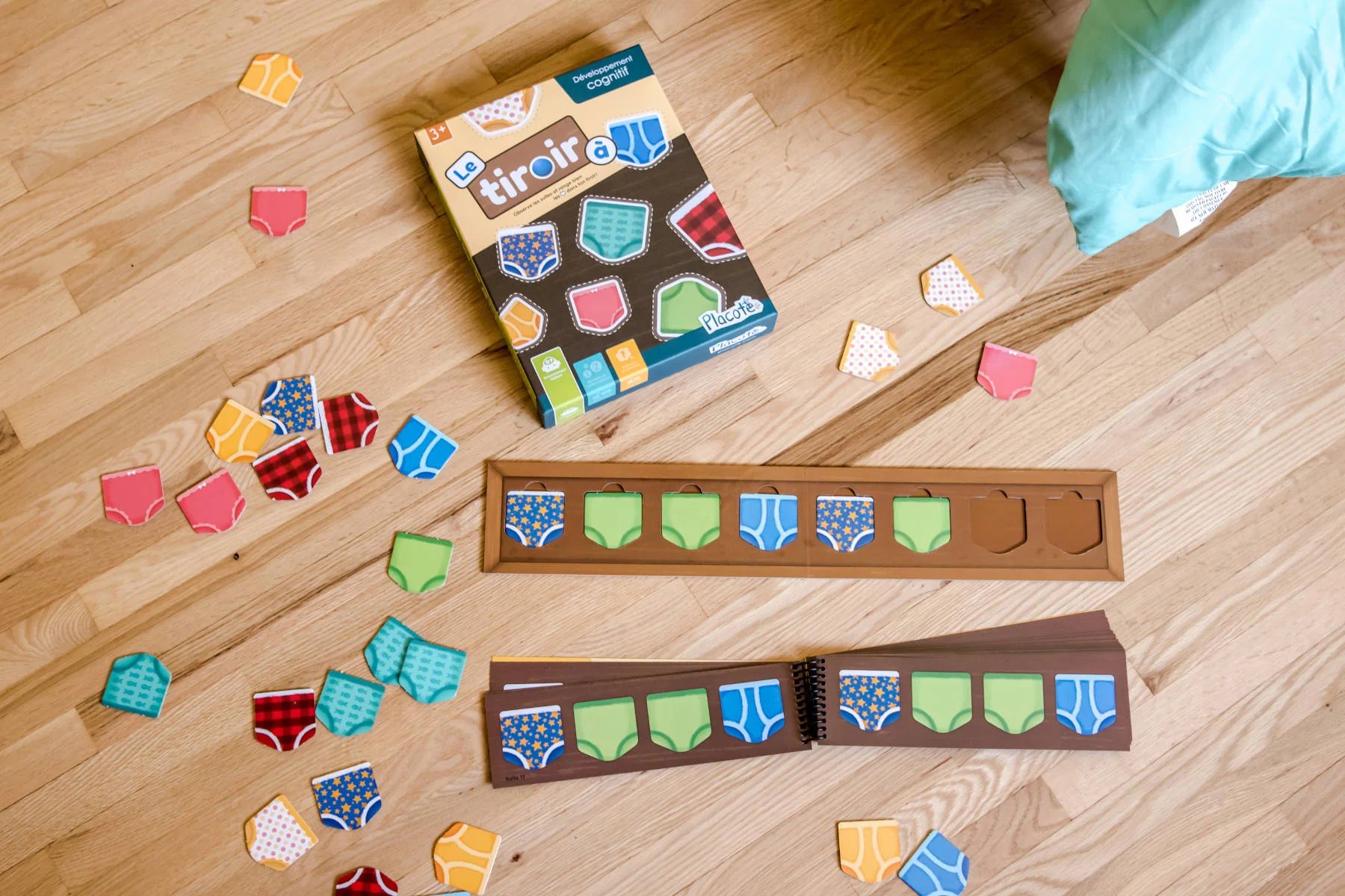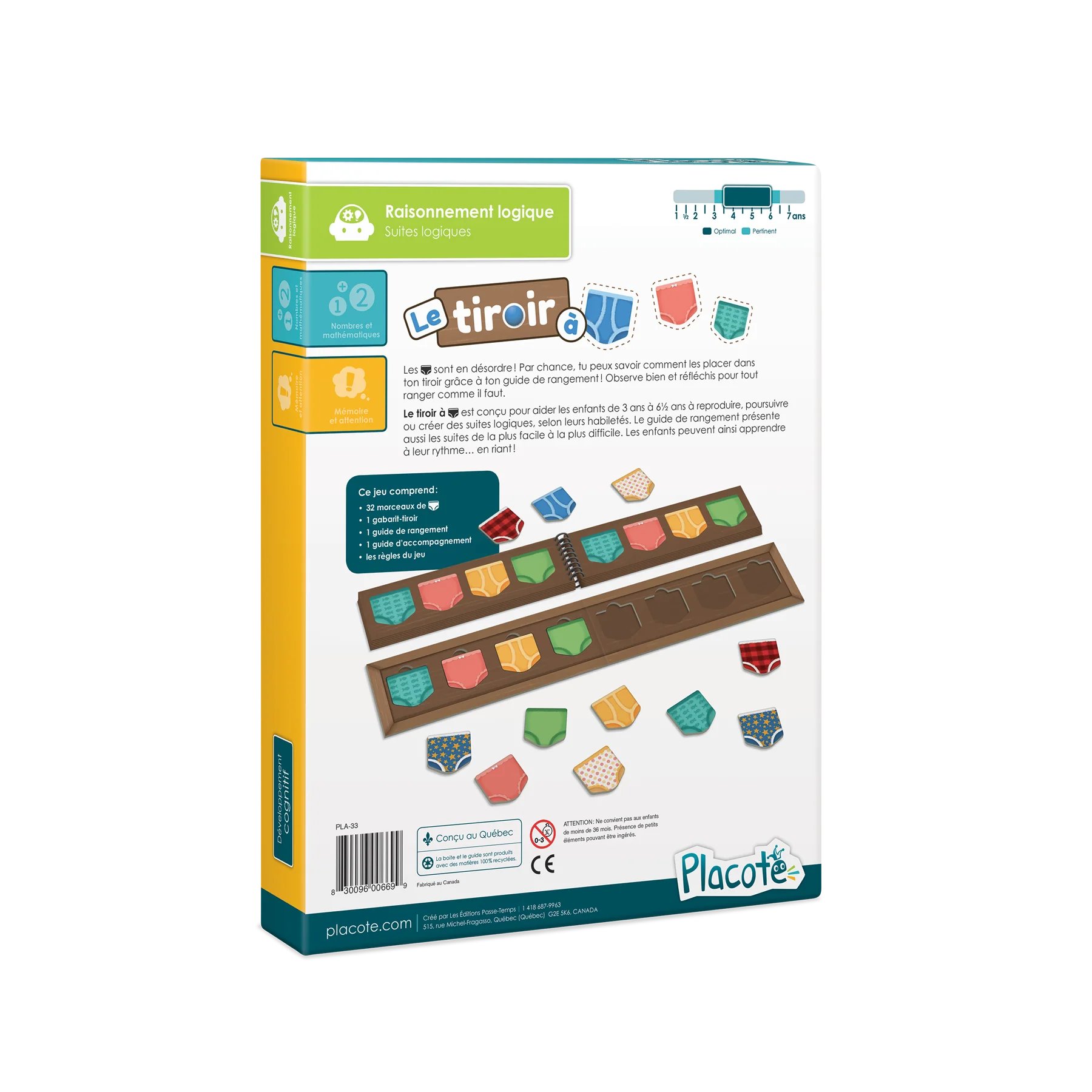 Le tiroir à culottes est conçu pour aider les enfants de 3 ans à 6½ ans à reproduire, poursuivre ou créer des suites logiques, selon leurs habiletés. Le guide de rangement présente aussi les suites de la plus facile à la plus difficile. Les enfants peuvent ainsi apprendre à leur rythme… en riant !