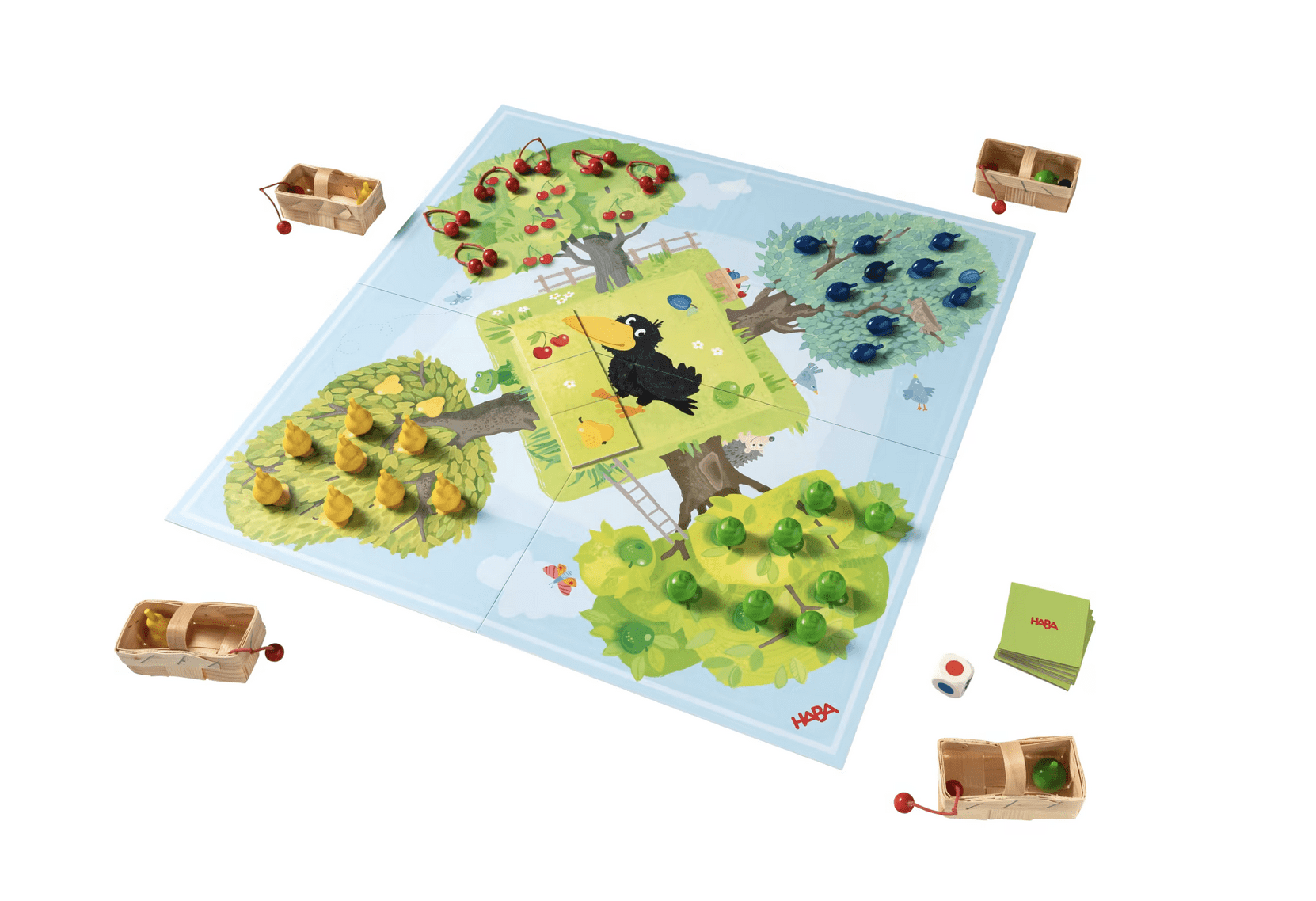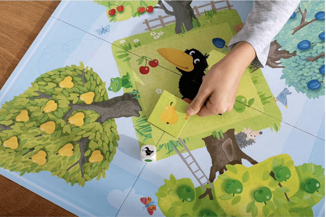 Cueillez vite les fruits avant le corbeau ! Le célèbre jeu classique HABA Le Verger est incontournable dans la chambre d’enfant. Ensemble, les enfants doivent cueillir les délicieux fruits en étant plus rapides que l’effronté corbeau Théo. Des règles du jeu faciles à comprendre permettent à tous les petits jardiniers de vite prendre plaisir à jouer. Le plateau de jeu Le Verger a été soigneusement conçu. Sur celui-ci sont représentés l’effronté corbeau et quatre arbres fruitiers. De plus, chaque arbre accueille 10 délicieux fruits en bois à classer sur les arbres du plateau de jeu. Après avoir lancé le dé, les enfants peuvent cueillir un fruit de la couleur correspondante et le mettre dans leur panier, ce qui exerce la reconnaissance et le classement basiques des couleurs. Si le dé indique l’effronté corbeau Théo, on pose une des neuf pièces de puzzle sur le plateau de jeu. Si les enfants réussissent à cueillir tous les fruits des arbres avant que le puzzle du corbeau ne soit complet, ils gagnent tous la partie. Ce jeu renforce le sens du collectif chez les enfants.