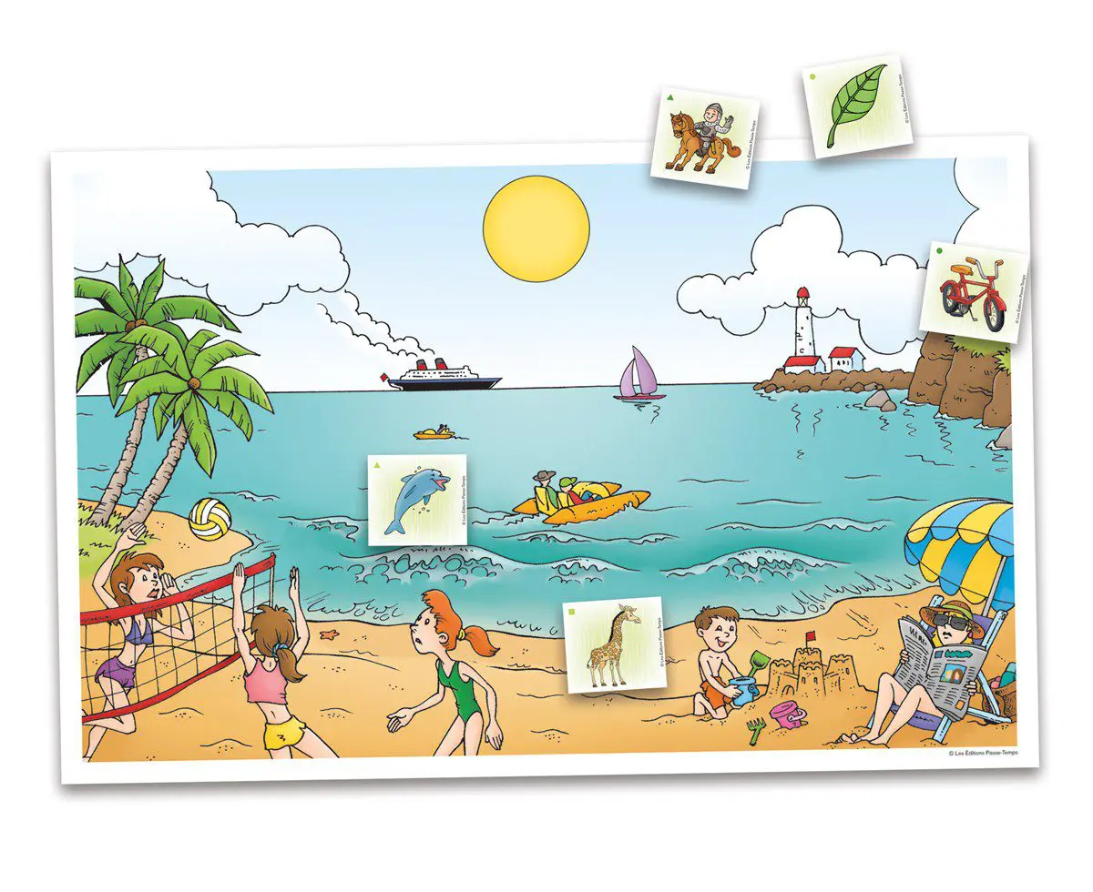 L'enfant place une à une les cartes-images sur sa planche en les décrivant avec suffisamment de précisions pour que l'autre joueur puisse réussir à placer les mêmes cartes au même endroit sur sa planche.