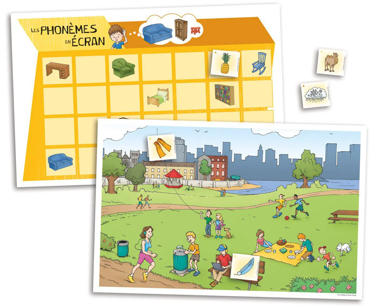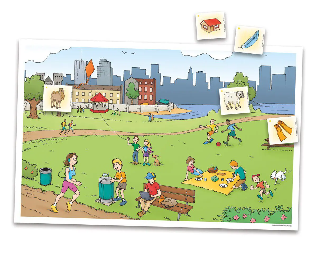 L’enfant place une à une les cartes-images sur sa planche en les décrivant avec suffisamment de précisions pour que l’autre joueur puisse réussir à placer les mêmes cartes au même endroit sur sa planche.
