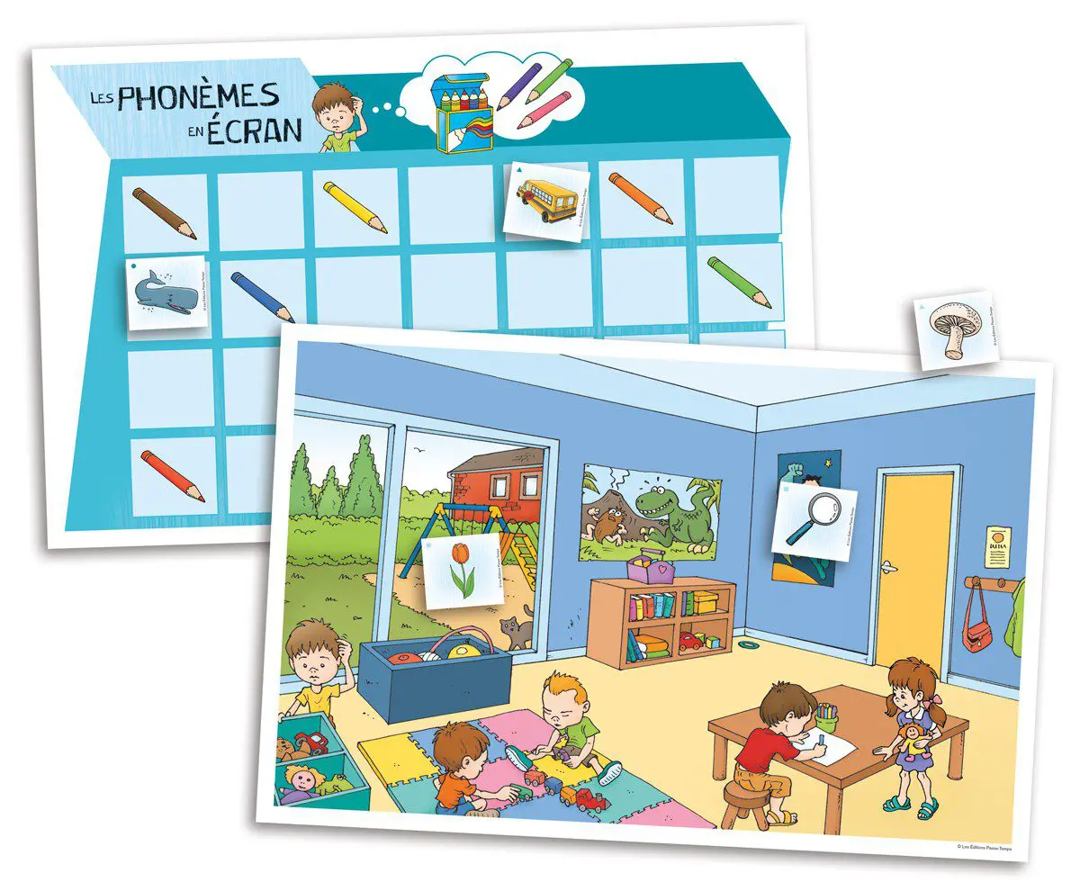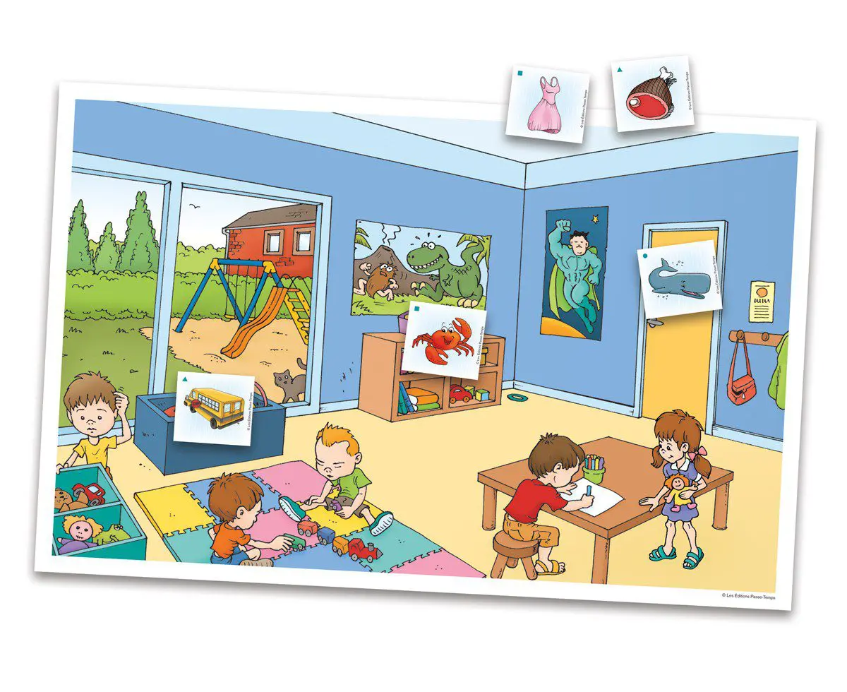 L’enfant place une à une les cartes-images sur sa planche en les décrivant avec suffisamment de précisions pour que l’autre joueur puisse réussir à placer les mêmes cartes au même endroit sur sa planche.