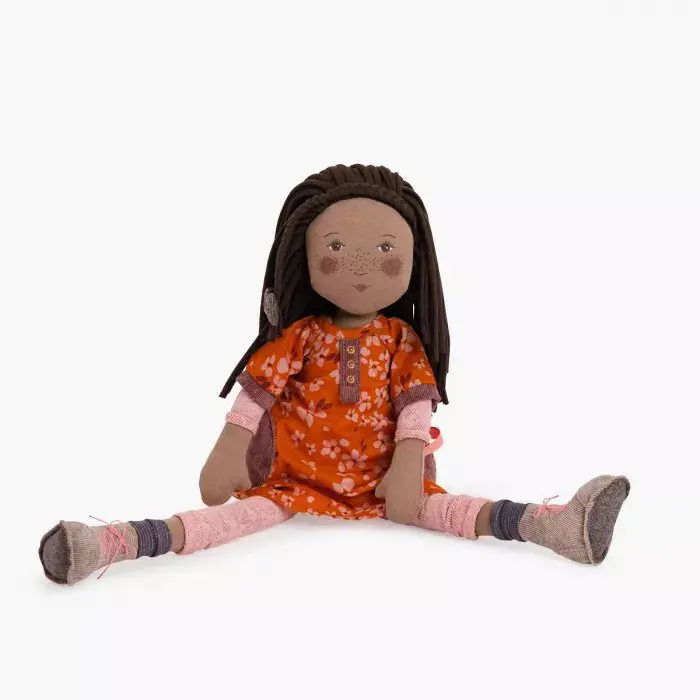 Grande poupée de chiffon, Camélia, au doux visage illustré et imprimé, avec de longs cheveux en jersey rouleauté surmontés d’une jolie tresse. Elle est chaussée de bottines à lacets, et vêtue d’une robe pep’s à fleurs avec legging en dentelle.