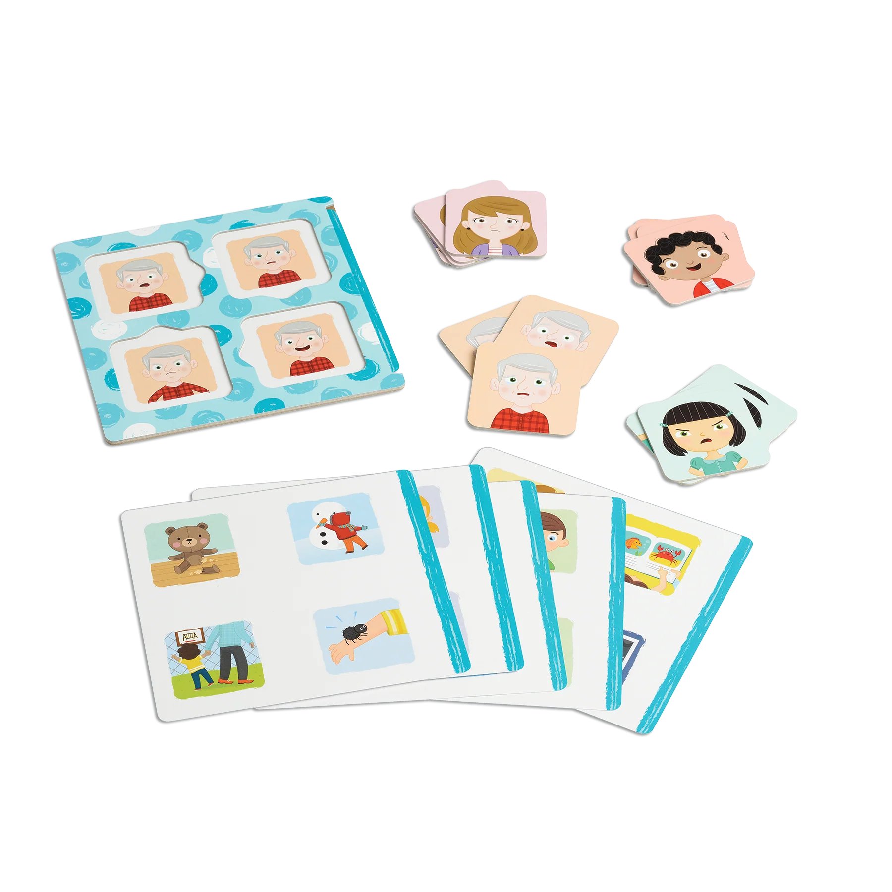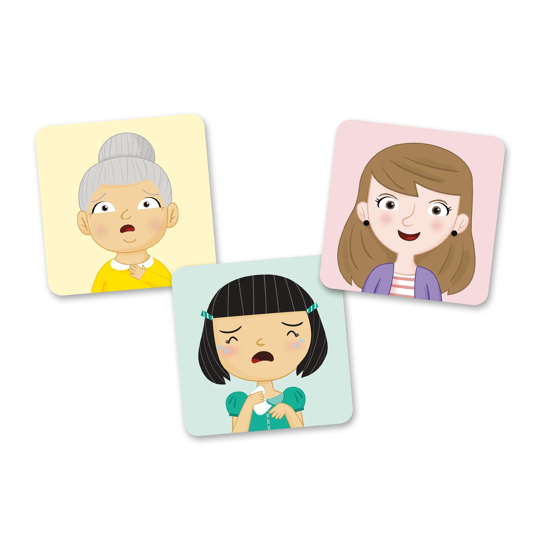 Apprends à reconnaitre les émotions de base ! Tu peux associer et nommer les émotions en plaçant les cartes aux bons endroits. Sauras-tu trouver les deux fillettes tristes identiques, ou encore le petit garçon et le grand-père en colère ? Par la suite, associe chaque image émotion à une cause.