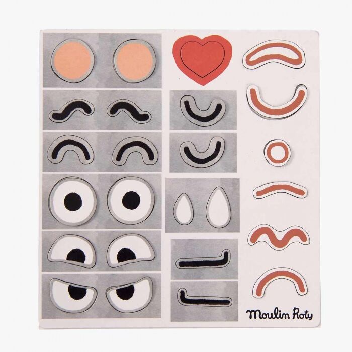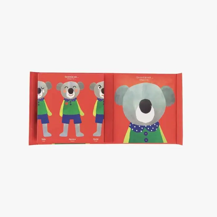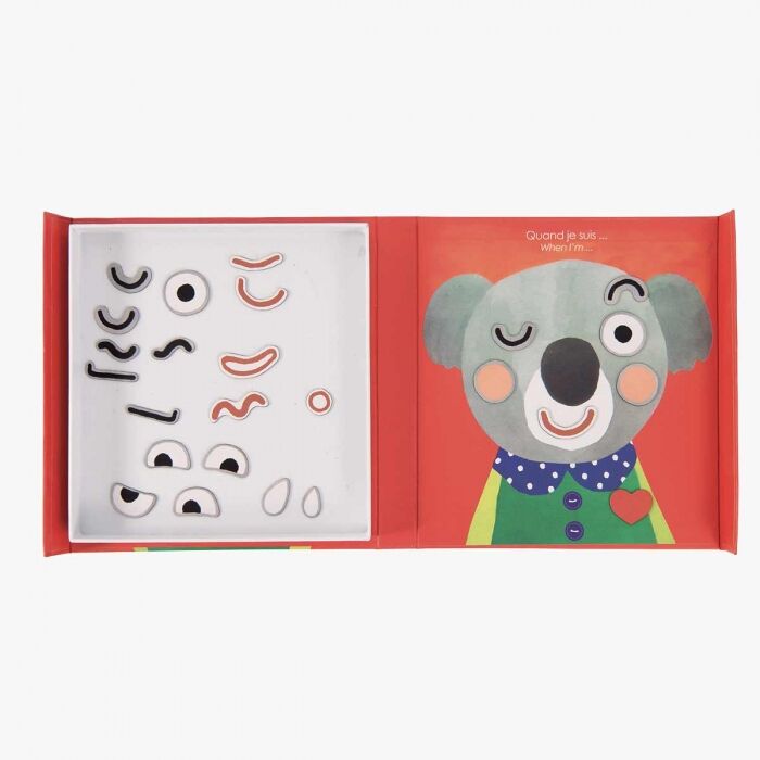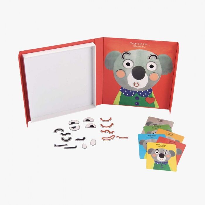 Illustrations rondes et colorées pour ce jeu 1er âge sous forme de livre-coffret aimanté. Sur un portrait de koala dessiné, on pose parmi les 25 magnets, yeux, bouche… à disposition, celles qui expriment l’expression de la carte piochée : la peur, la joie…