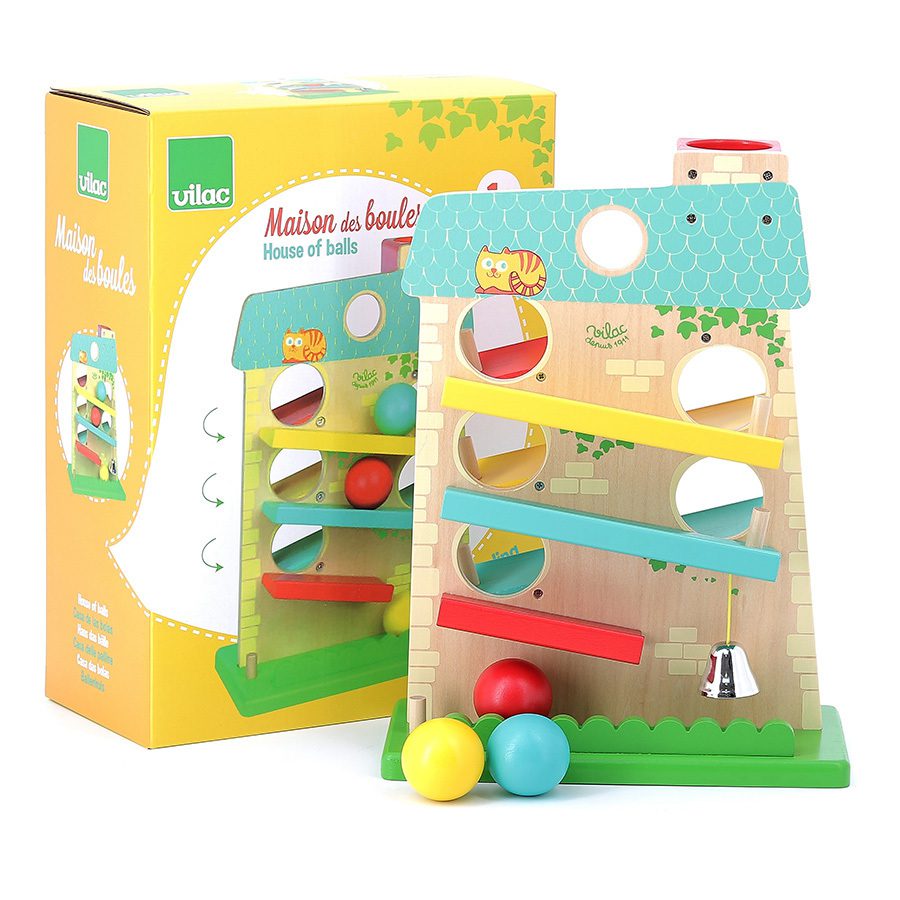 Amusante maison en bois, les boules en bois dégringolent le long des rampes et font tinter la cloche en arrivant en bas.
