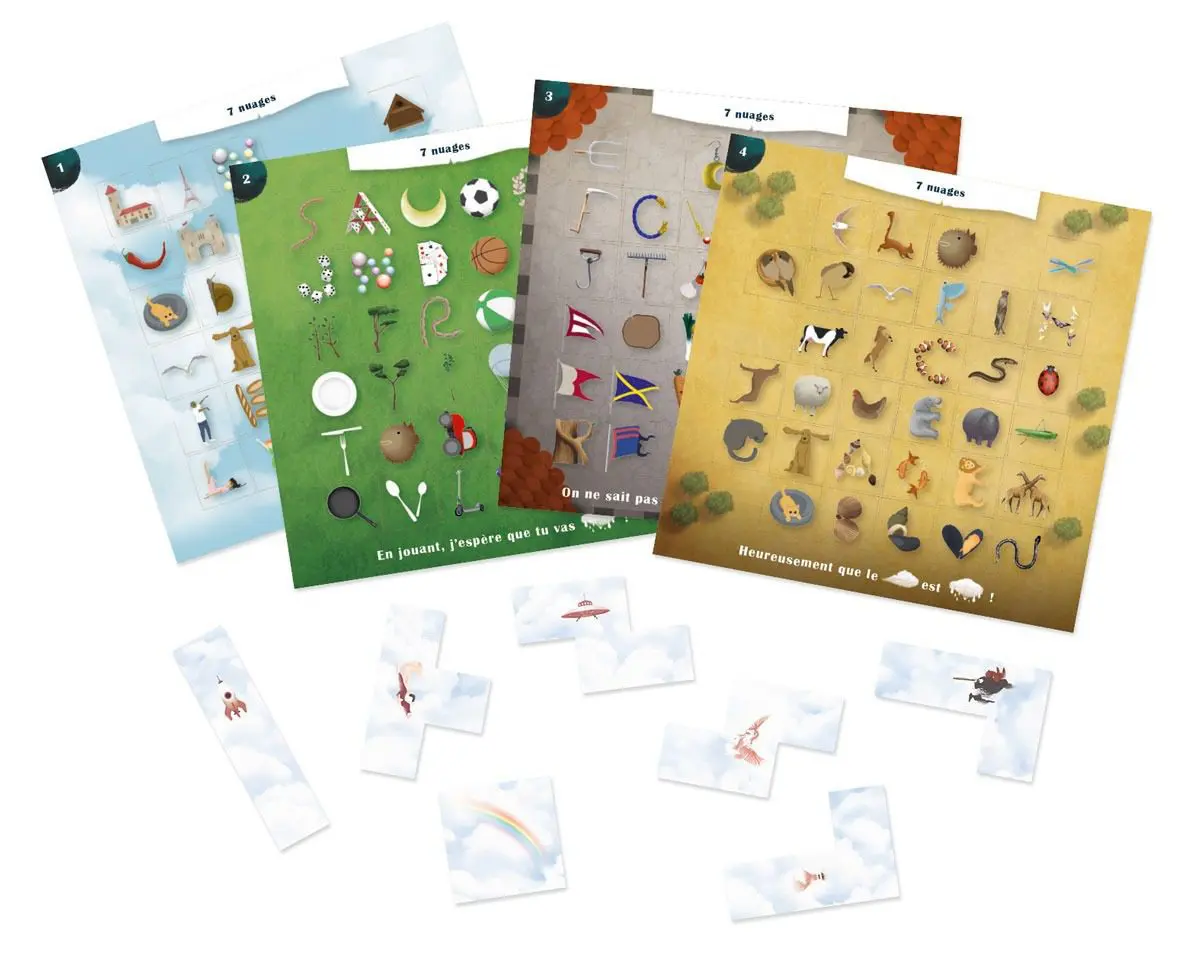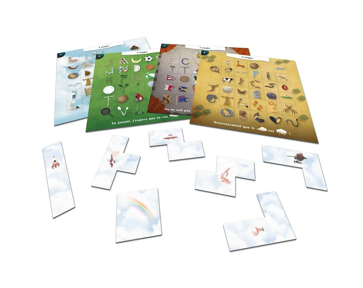 Regroupez les illustrations par groupe de 4 et cachez-les avec des nuages.