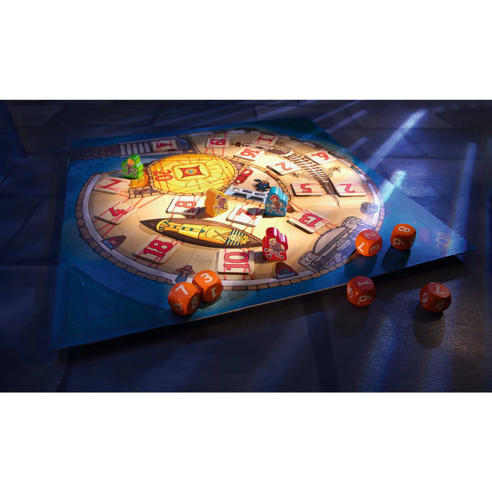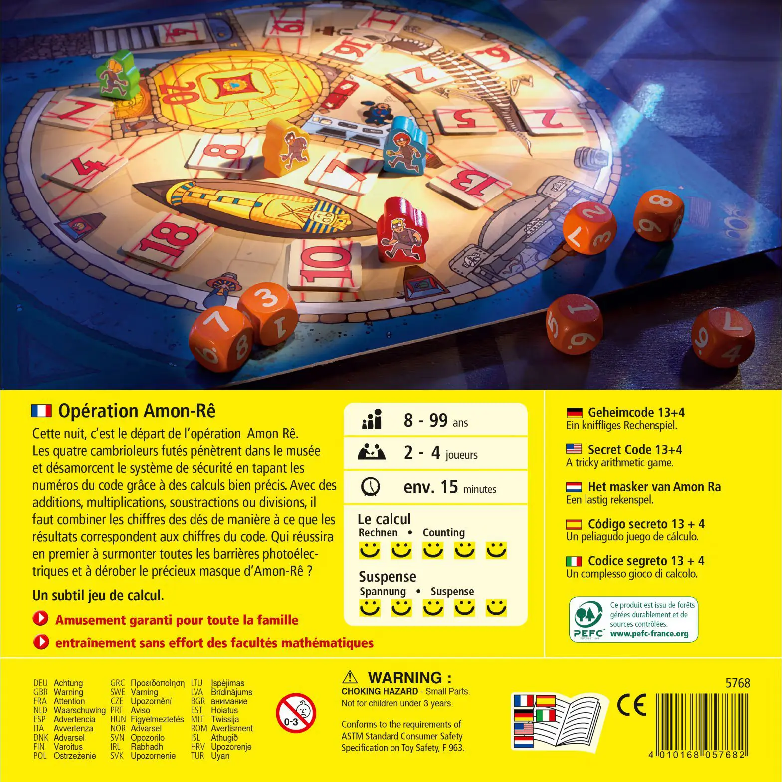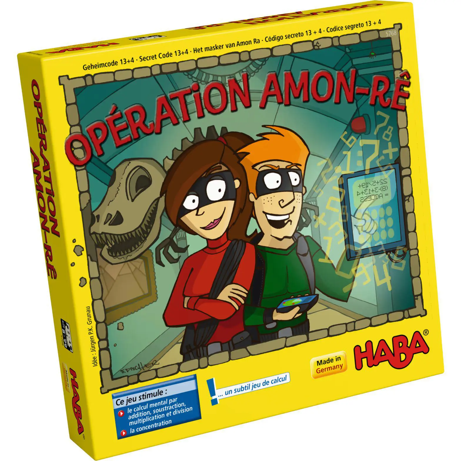 Cette nuit débute l'opération secrète « Amon-Rê » : dans ce jeu passionnant de HABA, une équipe d'agents secrets insaisissables pénètre dans le musée et désamorce le système de sécurité en tapant les numéros du code grâce à des calculs bien précis. Avec des additions, des multiplications, des soustractions ou des divisions, il faut combiner les chiffres des dés de manière à ce que les résultats correspondent aux chiffres du code. Qui réussira en premier à surmonter toutes les barrières photoélectriques et à dérober le précieux masque d’Amon-Rê ? Le subtil jeu de calcul Opération Amon-Rê est destiné à toute la famille et exerce en parallèle les capacités mathématiques de base.