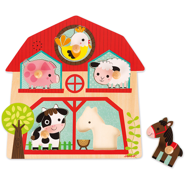 Ce puzzle sonore sur le thème des animaux de la ferme aidera votre enfant à se familiariser avec les animaux de la ferme et leur cri (vache, cheval, mouton, cochon et poule). Lorsque l'enfant pose la pièce de puzzle à la bonne place, le cri de l'animal retentit. Grâce aux tenons en bois, la prise en main des pièces de puzzle est plus facile.