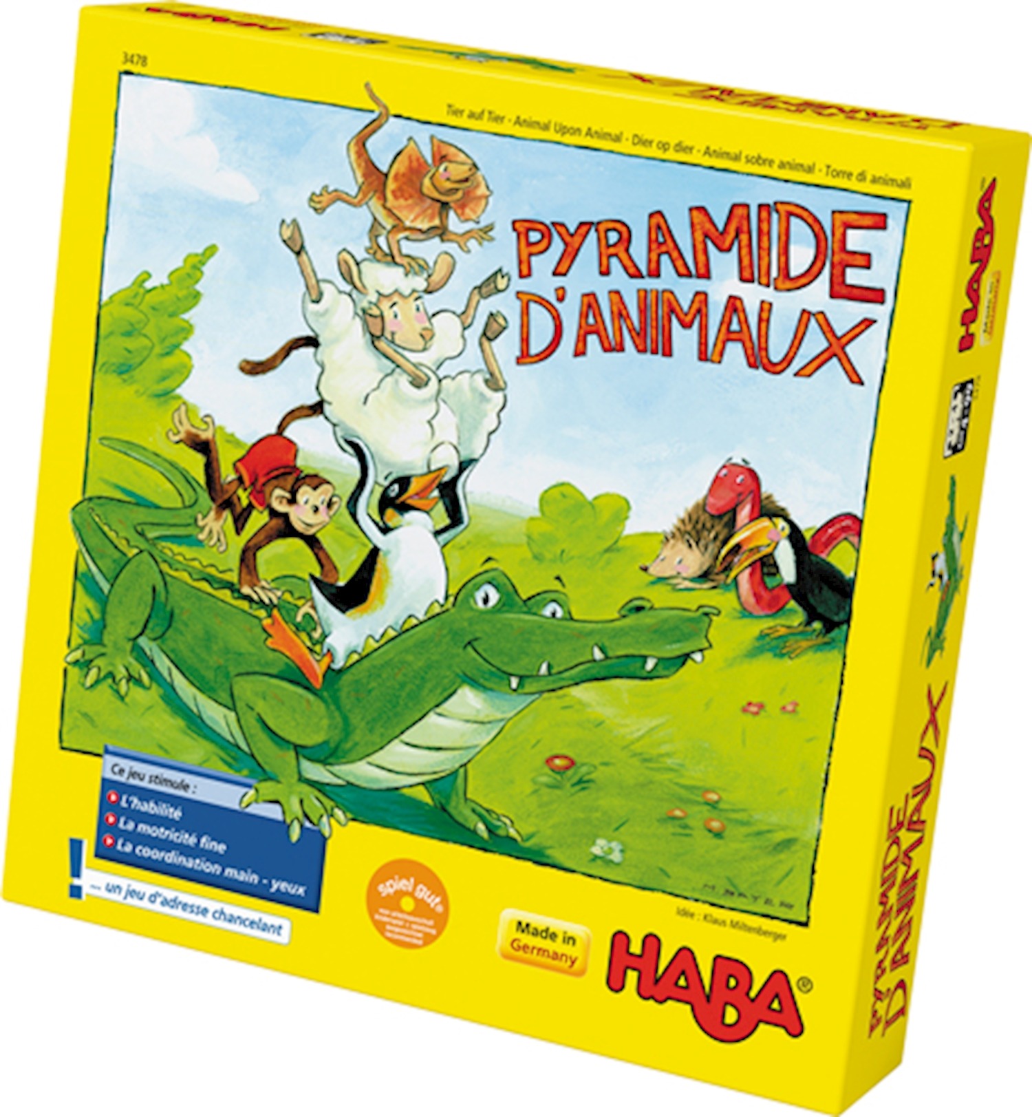 Les animaux vont former une grande pyramide. Il faudra aux joueurs de la patience et beaucoup d’adresse. Le flamant rose doit monter sur le crocodile, le mouton sur le flamant rose, le serpent sur le mouton…sans perdre l’équilibre ! Le premier joueur qui réussira à empiler tous ses animaux remporte la partie.