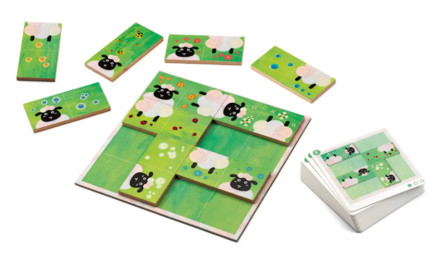 Les 10 dominos, le plateu et les cartes défis sont posés sur la table. Le joueur prend une carte défi et positionne sur le plateau les dominos imposés comme indiqué sur la carte. Puis il tente de compléter le plateau en plaçant les dominos de façon à obtenir des moutons complets. Seuls 2 dominos ne seront pas utilisés. Pour chaque défi, une seule solution possible !
