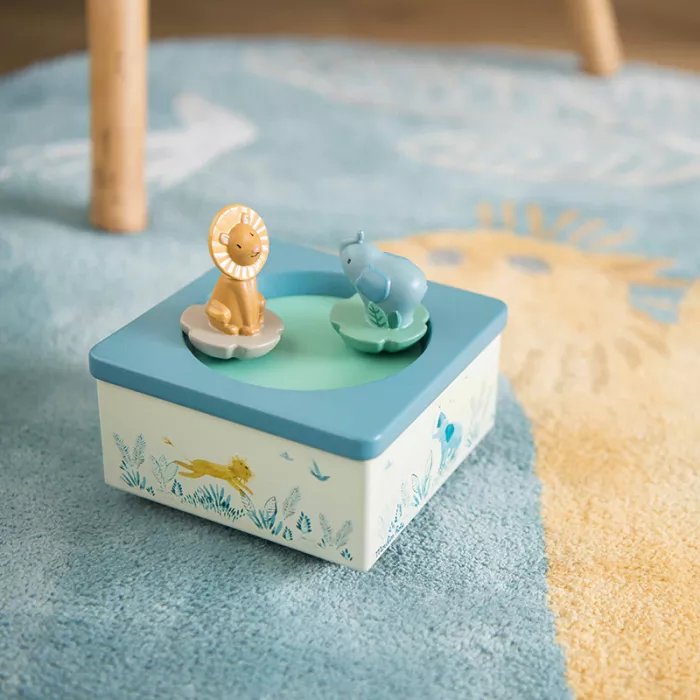Boîte à musique couleur crème, reprenant les illustrations de l'éléphant et du lion au milieu de la savane. Les deux personnages tournent et dansent sur une jolie musique pour endormir bébé.