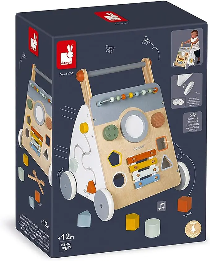 Ce joli chariot multi-activités à pousser est particulièrement adapté à l’apprentissage de la marche. Il accompagnera votre enfant en toute sécurité dès 12 mois : son frein invisible et amovible permet de bloquer les roues et de les libérer progressivement afin de maitriser la vitesse du chariot pendant l’apprentissage. En plus de la marche, votre enfant pourra tester sa motricité fine ainsi que sa dextérité avec les 9 activités ludiques proposées : boulier, boîte à formes, labyrinthe, engrenages, bouton rotatif sonore, « gratte-gratte », miroir rotatif grossissant, tambour et xylophone métal pour développer son éveil musical. Très astucieux, ce chariot d’activité est équipé d’un tapis en feutrine pour atténuer le bruit et amortir la chute des cubes. Enfin, ses roues sont silencieuses ! Si on ajoute à tout ceci, son design contemporain et ses couleurs douces, on ne peut que craquer ! On aime le bois naturel, le blanc et le gris, mis en valeur par les détails colorés des nombreuses activités de ce chariot premier âge pour bébé ! Offrir un chariot de marche multi-activités en bois à bébé, c’est lui proposer un jouet deux en un robuste et plein de charme. Un jouet intemporel qui pourra se transmettre de génération en génération, et qui fera craquer toute la famille ! La collection Sweet Cocoon, ce sont des jouets premier âge aux couleurs douces, aux formes arrondies, proposant des activités de découvertes amusantes pour bébé !