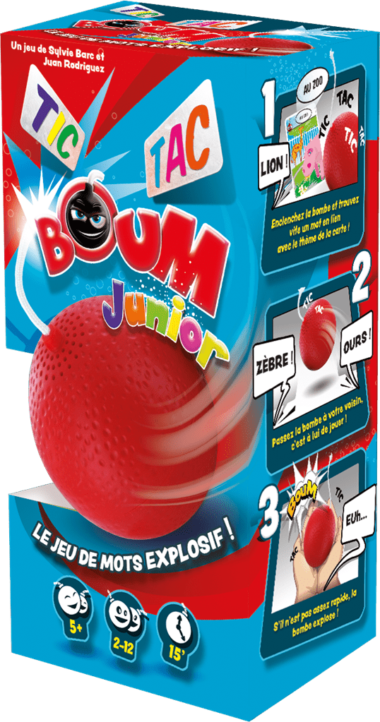Un jeu d’ambiance explosif ! Parlez avant le grand boum ! Le premier joueur lit le thème de la manche et déclenche la bombe. Dès lors, chaque joueur doit trouver un mot correspondant au thème imposé puis passer la bombe à son voisin. Le joueur qui se retrouve avec la bombe en main au moment de son explosion perd la manche. Il prend alors la carte de thème en jeu, la pose devant lui et devient le premier joueur de la manche suivante. À la fin des 13 manches de jeu, le joueur ayant obtenu le moins de cartes l’emporte.